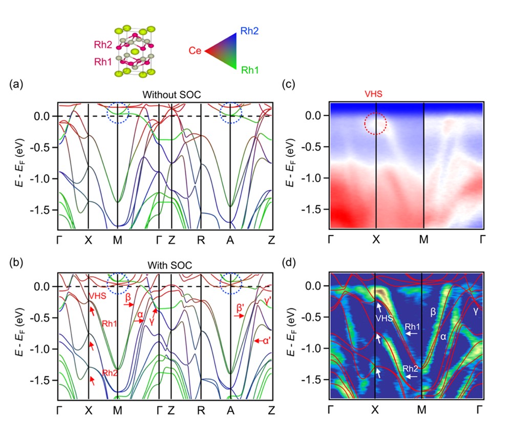 2021年,S.Khim等人在铈基重费米材料CeRh2As2中发现了上述磁场诱导超导配对宇称转变现象[2],同时发现其伴随的重费米子效应、四极矩密度波[3],反铁磁序[4] 等丰富的物性(图 1)。相比于具有类似晶体结构但不具备如此相图的其他材料(如LaRh2As2),CeRh2As2的局域对称性破缺的晶体结构和f电子对于上述新奇物性起着至关重要的作用[5]。费米能附近的电子结构是理解材料物性和机理的关键因素,然而CeRh2As2的电子结构信息一直都缺乏。