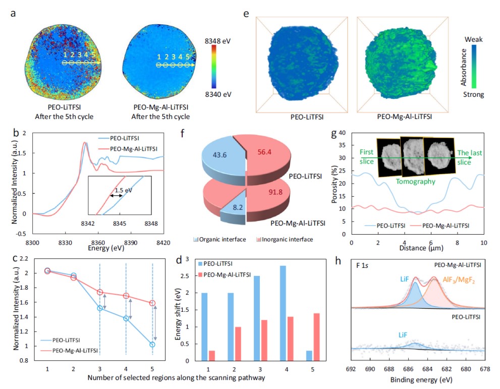 图 a和b中的二维化学态相图展示了PEO-LiTFSI和PEO-Mg- Al-LiTFSI 中的 Ni83 粒子(放电态)在循环后吸收边能量的偏移。表明了Lewis酸配位效应提高了界面稳定性,促进了界面 Li+ 的传输和 SOC(State of Charge)的均匀性。