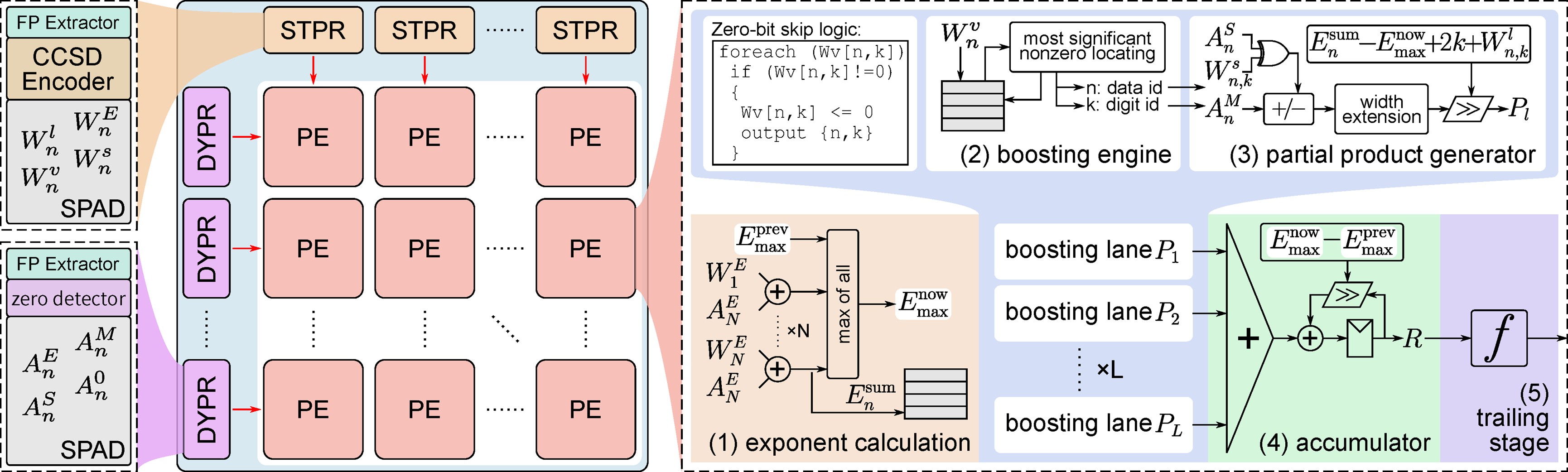 提出的Bit-Cigma架构是一种可扩展的比特稀疏感知架构,能够灵活支持多种数据类型,为各类矩阵乘法任务提供卓越的性能、精度和效率。该架构基于团队提出的一种紧凑型规范有符号数(CCSD)编码技术,以减半于传统方法的硬件成本实现高效片上稀疏化,通过最大化比特稀疏性显著削减冗余计算。为了验证该架构对大规模矩阵运算的支持能力,团队设计了分段式处理方法,将矩阵分解为大小合适的数据块并动态执行浮点数对阶,从而在避免增加硬件资源的同时确保计算零误差,大幅提升处理速度与吞吐量。