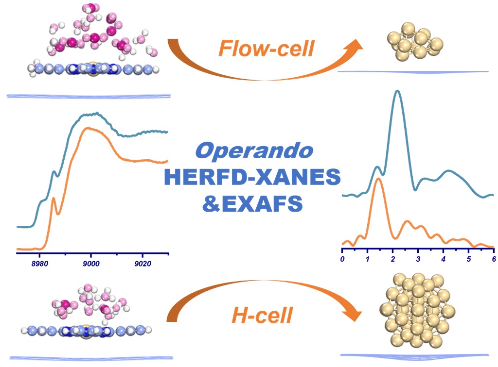 受限于常规表征方法的分辨率,之前的研究工作对CO2RR反应中传质的影响缺少量化评价数据。在此背景下,光源中心宋飞研究员团队通过结合工况Operando EXAFS(扩展X射线吸收精细结构)以及HERFD-XAFS(高能分辨率荧光检测X射线吸收光谱)谱学表征方法,实时监测了模型催化剂在CO2RR过程中,不同传质环境下催化剂表面的动态变化。研究发现,不同传质环境会影响模型催化剂酞菁铜(CuPc)在CO2RR反应中Cu-N4的分离和Cu原子的团聚,从而决定了不同的反应性能和选择性。结合SR-IRAS(同步辐射红外光谱)和DFT理论计算,从反应动力学角度推演了催化剂的结构演化;该项研究还系统比较了CO2RR反应中所用器件的调控机制,可为后续反应器件的开发提供指导原则。研究成果以"Quantitatively Unveiling the Effect of Mass Transfer on CO2RR through Operando EXAFS and HERFD-XAFS"发表在Science China Chemistry上。