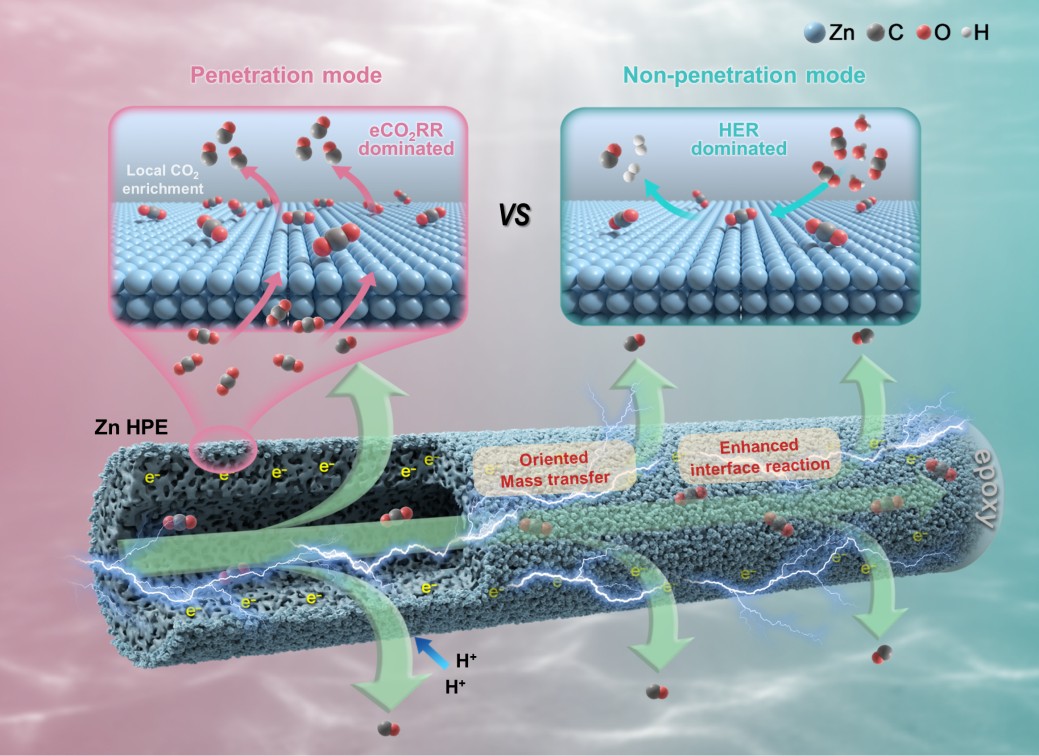研究人员开发了一种新型Zn HPE材料具有优良的eCO2RR制CO性能,在800 mA cm−2电流密度下运行110小时,CO法拉第效率仍能维持90%。经济性评估表明,每吨CO的电极材料成本仅为58.01美元,总成本降至385.53美元/吨,综合性能优于最近报道的具有代表性的先进电催化剂。实验数据和理论模型相结合,证实Zn HPE的透散模式通过多孔壁强制CO2向电解液透散,显著提高了CO2的溶解速率和局部富集浓度,从而大幅提升了CO2传质效率,使eCO2RR在高电流密度下保持高效运行。DFT计算表明,局部高CO2覆盖度可降低关键中间体形成能垒,增强CO选择性的同时有效抑制HER。