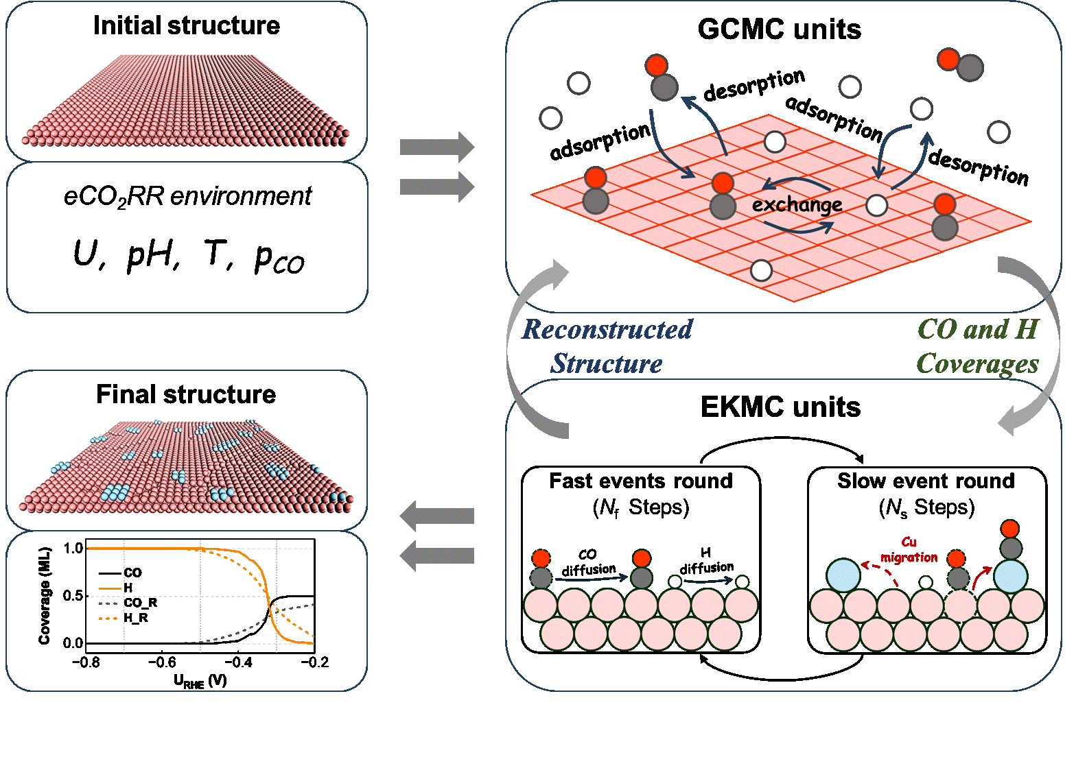 基于以上研究背景,高嶷研究员团队基于本组发展的反应环境动力学蒙特卡洛(EKMC)模拟方法,结合电势依赖的巨正则蒙特卡洛(GCMC)模拟和密度泛函理论(DFT)方法,针对eCO2RR的关键中间体诱导Cu(100)表面原子级重构机理和重构表面对反应性能的影响进行了系统研究。研究成果以“Reaction-Driven Varieties of Active Sites on Cu(100) in Electrochemical CO2 Reduction Reaction”为题发表在ACS Catalysis上。