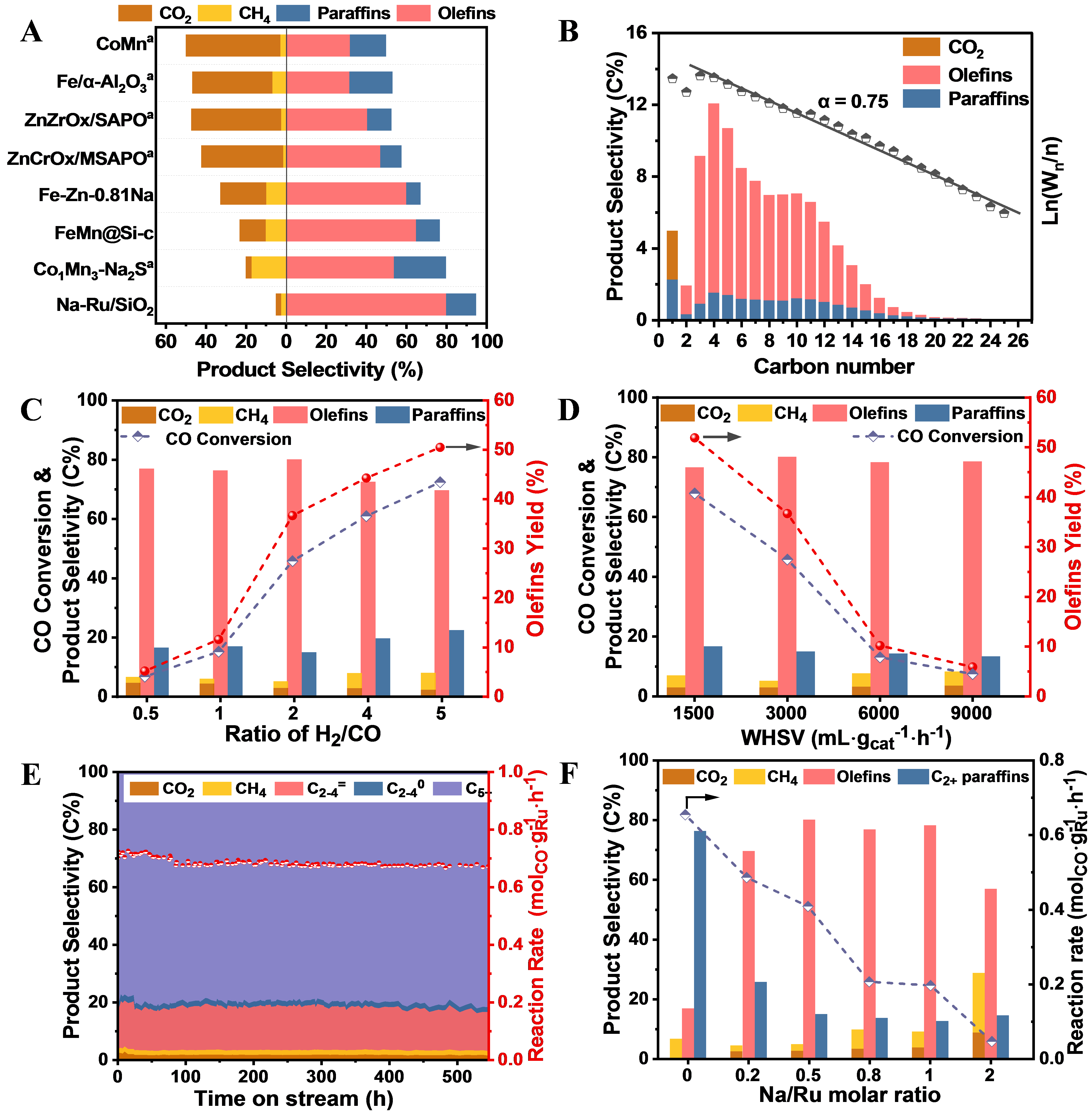 烯烃包括低碳烯烃(C2-4=)和长链α-烯烃(C5+=),是现代化学工业的基本原料和重要中间体,广泛用于塑料、溶剂、润滑油、药物、化妆品等高附加值产品的生产。传统上,长链α-烯烃主要通过石油基乙烯齐聚获得。我国80%以上的C6+长链α-烯烃需要依赖进口。除了石油路线外,非石油含碳资源通过合成气转化也能得到烯烃。近年来,合成气直接制烯烃取得了重大突破(Science, 2012, 335, 835; Science, 2016, 351, 1065; Nature 2016, 538, 84; Science,2021, 371, 610),发展了基于氧化物-分子筛的双功能路线(OX-ZEO)以及基于Fe/Co基的费托合成路线(FTO)。然而,目前所报道的催化体系中,产物中较高的C1副产物(CO2和CH4)选择性(30%~50%)极大降低了反应过程碳利用效率和烯烃收率。此外,较高的CO2选择性也导致后续脱碳、产物分离等过程能耗的增加。在“碳达峰”和“碳中和”的背景下,有必要研制全新的高碳效合成气直接转化制烯烃催化剂,大幅降低C1副产物选择性,实现高活性高选择性获取长链α-烯烃,进一步促进过程的节能减排增效。