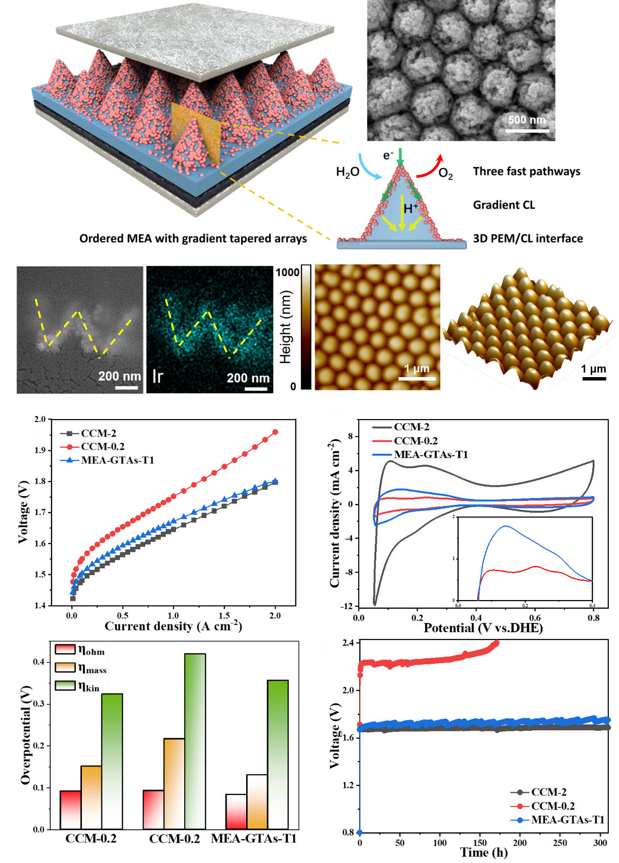 鉴于此,研究团队从MEA结构一体化设计的角度出发,创新地提出利用纳米压印技术结合静置法制备一种阳极兼具梯度化锥形阵列及三维膜/催化层界面的新型有序结构MEA。锥形阵列及梯度催化层结构增加了活性位点的暴露;梯度及三维膜/催化层界面增强了界面结合强度;垂直排列的空隙为气、液传输提供了快速通道。该结构MEA可同时降低电催化动力学、欧姆与传质极化造成的性能损失。与Ir载量为2 mg cm-2的传统MEA相比,该有序结构将电化学活性面积提高至4.2倍,同时分别将传质和欧姆极化过电位降低了13.9 %和8.7 %。因此,这种新型有序 MEA在Ir 载量低至0.2 mg cm-2时,仍表现出1.801 V @ 2 A cm-2的优异性能,与Ir载量是其十倍的传统结构MEA性能相当,并表现出良好的稳定性。本研究为开发高性能、低贵金属催化剂载量及长寿命的PEMWE提供了一个新策略。
