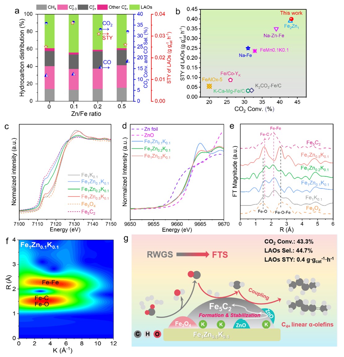 近期,研究团队率先报道了具有超高LAOs产率与稳定的FeZnK催化剂及其构效关系与反应机理。通过燃烧法制备了一系列FeZnK催化剂,能够高效且选择性地催化CO2加氢合成LAOs。其中,最优催化剂Fe1Zn0.1K0.1催化剂因其具有适量的Zn−O−Fe界面和活性Fe5C2物种,展现出44.7%的LAOs选择性和43.3%的CO2转化率,时空收率(STY)高达0.40 g/g/h,超越了目前最先进的铁基催化剂的性能。反应结果和多种表征表明,适量引入Zn助剂不仅能通过形成Zn−O−Fe界面增强CO2吸附能力,还能通过促进活性Fe5C2物种的形成提高LAOs选择性。此外,研究发现活性Fe5C2物种倾向于在FeZnK催化剂的体相中形成,体相Fe5C2含量与催化活性的相关性更为密切。本工作除了开发一个高性能的铁基催化剂CO2加氢制LAOs,展示未来工业化的巨大潜力,还提供了一个有效的策略来设计高效和稳定的铁基催化剂。