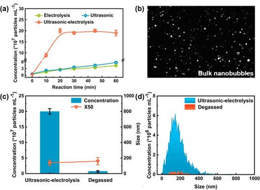 图1:(a) 超声辅助促进电解产生氢气纳米气泡,(b) 纳米气泡的颗粒追踪图像,(c)脱气对照。(d) 氢气纳米气泡的尺寸分布