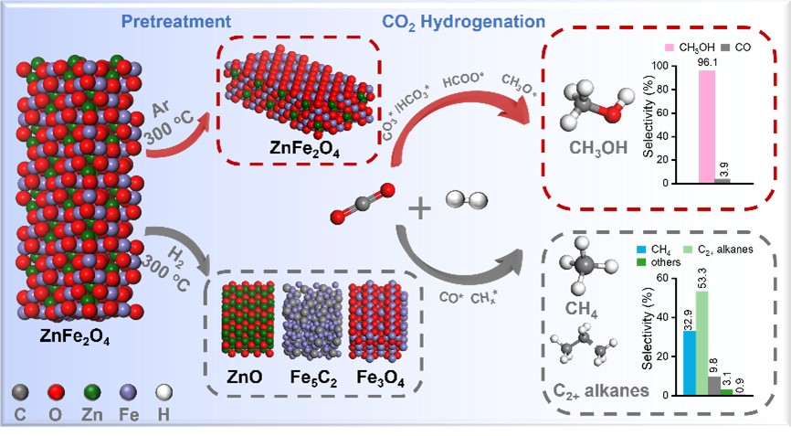 近日,低碳转化科学与工程中心绿色碳科学团队/低碳催化与二氧化碳利用全国重点实验室高鹏和李圣刚研究员团队在ZnFe2O4催化CO2加氢制甲醇的活性相研究中取得重要进展。研究团队系统考察了预处理气氛对尖晶石型ZnFe2O4氧化物结构及其催化性能的影响。发现经氩气预处理的ZnFe2O4保持了完整的尖晶石结构,在CO2加氢反应中展现出高达96.1%的甲醇选择性;与之形成鲜明对比的是,在氢气中活化的催化剂,其尖晶石结构遭到显著破坏,致使CO和烃类成为主要产物。综合原位表征、动力学测试与密度泛函理论(DFT)计算揭示:结构完整的尖晶石型ZnFe2O4氧化物能为CO2和H2的吸附与活化提供最优的活性位点,从而实现高甲醇选择性;而ZnO和Fe3O4纳米颗粒表面,因CO2解离为CO的能垒显著降低,更有利于CO的生成。此外,在H2氛围下预处理的ZnFe2O4催化剂在反应中原位生成的Fe5C2物种,是催化产生甲烷及C2+烷烃的关键活性相。该研究为深入理解催化剂结构-性能关系提供了机制支撑,并为高效CO2加氢催化剂的理性设计提供了新思路。