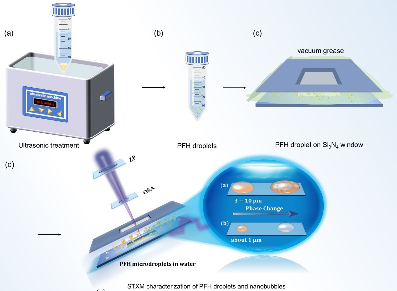 全氟碳化合物因具有优异生物相容性,在生物医学和工业领域应用价值显著。其中,低沸点全氟碳(PFCs)微液滴在生理条件下稳定,可在能量刺激下实现液滴-气泡快速相变,不仅为肿瘤靶向超声成像与药物递送提供新思路,也是研究微尺度相变的理想模型体系。然而,传统技术难以实现多尺度、多相态、纳米级分辨的原位观测。同步辐射软X射线谱学显微技术的发展为此提供了全新解决方案。