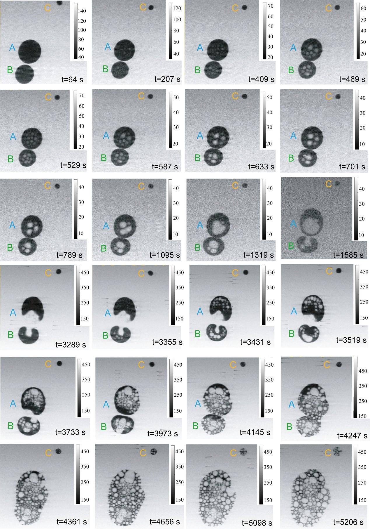 图3. 在689 eV下的原位STXM图像显示了PFH纳米气泡的形成,随着时间推移PFH微滴和纳米气泡的尺寸变化。扫描区域:40 × 40 μm²。