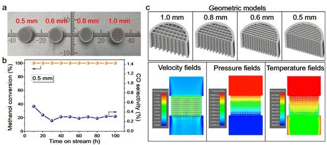研究发现,与其他金属相比,由于Cd与P25相界面具有能量适配性,Cd原子可稳定锚定于P25的锐钛矿(101)-金红石(110)相界面缺陷处,形成具有不对称几何与电子特性的Cd-O-Ti相界面位点。这一独特结构增强了电子转移及反应物的吸附活化能力,使得其氢气产率分别是锐钛矿和金红石表面单原子位点的15倍与8倍,同时实现了100%甲醇转化率、超低CO浓度(~0.1 mol%)及超150小时的稳定性(图1)。通过H₂预处理后,相界面密度最高可达10.1 m² g⁻¹,氢气产率进一步提升至292.9 mmol・g⁻¹・h⁻¹。结合原位红外、动力学同位素效应及理论计算等表征手段,证实反应遵循甲酸盐分解路径,相界面位点显著降低了甲酸盐形成及H₂O吸附解离的能垒,同时抑制CO生成,从而解释了其优异性能的成因。此外,该粉末催化剂可通过3D打印制成千克级多孔整体式催化剂,进一步优化反应过程中的传质与传热效率,使CO浓度降至0.07 mol %(图2)。