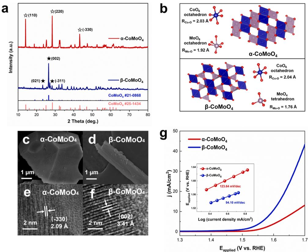 图1. 同分异构体α-CoMoO4和β-CoMoO4的结构和性能比较