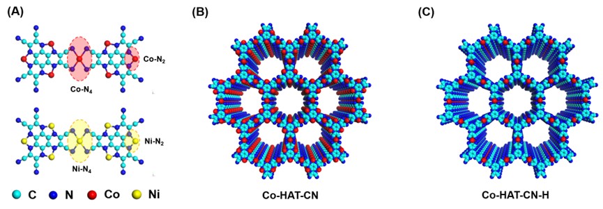 在此背景下,该团队整合MOF和COF的优势构建了具有双催化中心(金属-N4和金属-N2)的新型金属有机聚合物(Co-HAT-CN和Ni-HAT-CN)来催化ORR和OER(图1)。该催化剂利用不同的金属离子和催化位点作为催化中心,具有可调的催化活性和选择性。通过对局部原子和电子结构的研究发现,Co-N与Ni-N的配位数均为3.9,表明存在M-N4和M-N2(M=Co,Ni)双位点,验证了M-N4和M-N2的构型(图2)。在饱和氧的0.1 M KOH溶液中,Co-HTA-CN的半波电位(E1/2=0.80 V)与Pt/C相接近,Tafel斜率最低为74 mV dec-1,表明其快速动力学性能。在1.0 M KOH溶液中Co-HTA-CN的OER(Ej10=350 mV)活性较商业RuO2更好,且具有更低的Tafel斜率(24 mV dec-1)。此外,通过验证催化剂的选择性与不同位点的催化作用,证明了Co-HAT-CN和Ni-HAT-CN分别通过四电子、二电子途径催化ORR,Ni-HAT-CN过氧化氢选择性超过90%。催化剂通过M-N4位点催化ORR,M-N4和M-N2位点的共同作用催化OER。这项工作是统一MOF高导电性和COF高稳定性的优点作为电催化剂的突出例子,为多孔电催化剂材料的设计提供了新的思路。