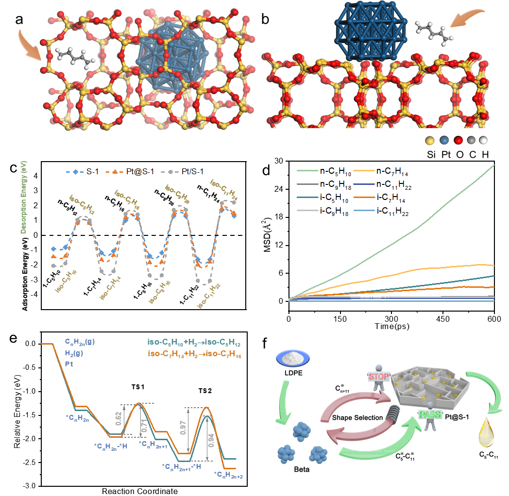通过DFT计算证明了Pt@S-1相对适中的烯烃吸附强度以及烷烃的脱附强度,有助于中间产物烯烃的加氢反应和目标产物烷烃的快速转移;分子动力学计算显示,短碳链烯烃在S-1孔道中优先扩散,从而有利于C5-C9产物的集中。Pt@S-1的择形作用更有利于正构以及短链异构烯烃在Pt纳米颗粒上进行加氢反应,而长链烯烃中间产物则由于较大的吸附和扩散阻力返回至β分子筛进行深度裂解。具有断键和异构作用的β分子筛与加氢Pt@S-1的协同作用,强化了LDPE加氢裂化生成高选择性石脑油产物的反应过程。