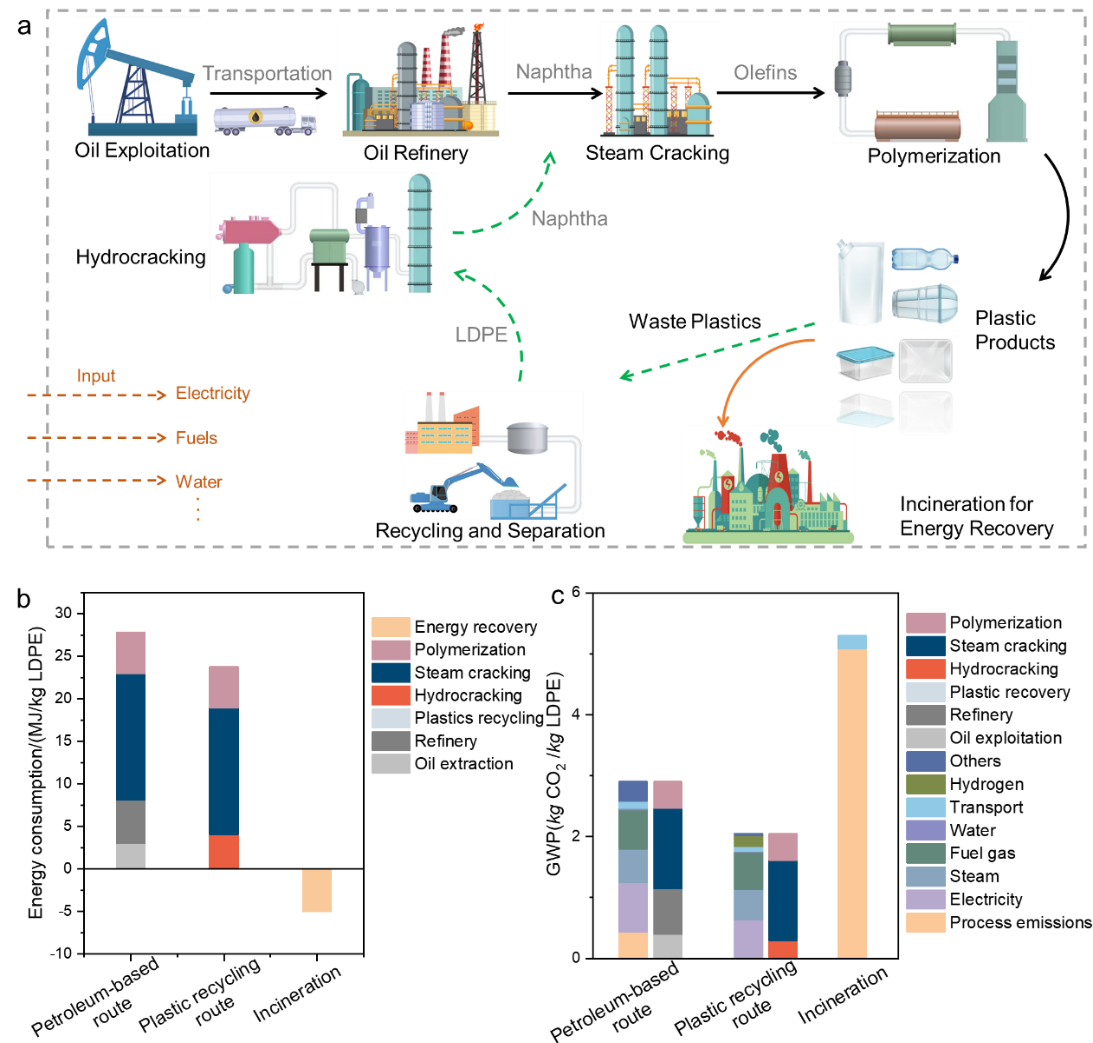 总之,该研究通过分子筛限域和串联催化,将废塑料高效催化降解为石脑油,用于聚乙烯的循环再生,实现塑料的闭环使用,能够有效降低整体的能耗和碳排放,有助于实现碳中和目标。