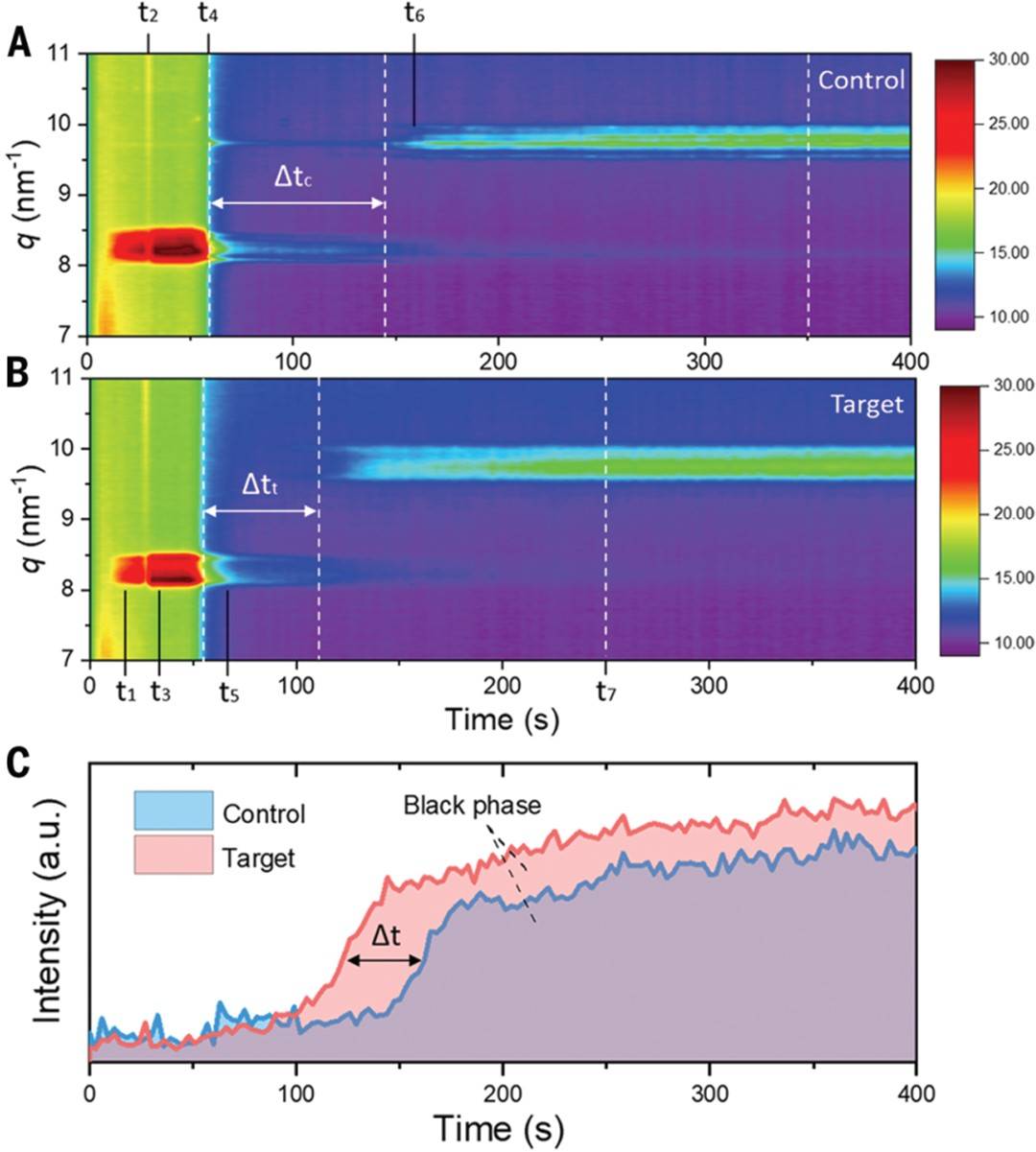 为了深入了解钙钛矿薄膜的结晶过程,作者进行了基于同步辐射GIWAXS来表征薄膜形成的整个过程。从GIWAXS的结果可知(图1 A和B),在初始60s内,衍射信号明显减弱,这表明DMSO-DMF-PbX2的中间相被抑制了。这种效果可以归因于被长链β-pV2F分子隔离的中间相。在成膜过程中观察到的以q = ~10 nm-1沿(001)晶面为中心的散射特征表明,胶体已经凝固并转化为黑色相。值得注意的是,作者发现目标薄膜的黑相比对照薄膜的黑相出现得早(Δtt>Δtc),这意味着β-pV2F促进了中间相向钙钛矿黑相的转化。快速的相转换与较低的形成能量有关,可能是由于β-pV2F在DMSO和DMF挥发的过程中迅速聚集了分散的PbX2和有机盐。当结晶完成时(阶段t7),目标薄膜的信号比对照薄膜更强烈(图1c)。这一结果表明,形成的目标钙钛矿薄膜更加有序。因此,β-pV2F通过降低钙钛矿的形成能量来控制钙钛矿的结晶动力学,促进相变,并使晶体结构更加有序。