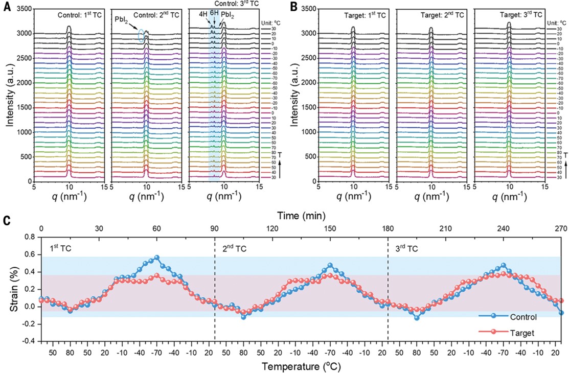 为了深入研究器件优异耐变温特性的来源,利用同步辐射GIWAXS进一步研究了变温过程中β-pV2F对钙钛矿薄膜的形态和晶体结构的影响。如图2A,B所示,目标钙钛矿中温度诱导的薄膜降解受到了抑制,同时变温过程中晶粒挤压引起的晶界形变也受到抑制,目标钙钛矿结构稳定性显著提高。如图2C所示,钙钛矿应变随温度循环而产生变化,表明钙钛矿中的晶格参数发生变化;相比之下,目标钙钛矿在较窄的范围内(-0.06%至0.38%)表现出稳定的应变循环,这表明目标钙钛矿具有可恢复的晶体结构和可释放的晶格应力。