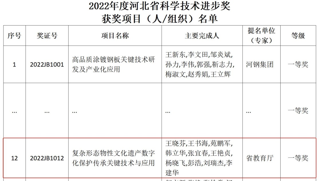 赢乐lV参与的“复杂形态物性文化遗产数字化保护传承关键技术与应用”项目荣获河北省科学技术进步一等奖