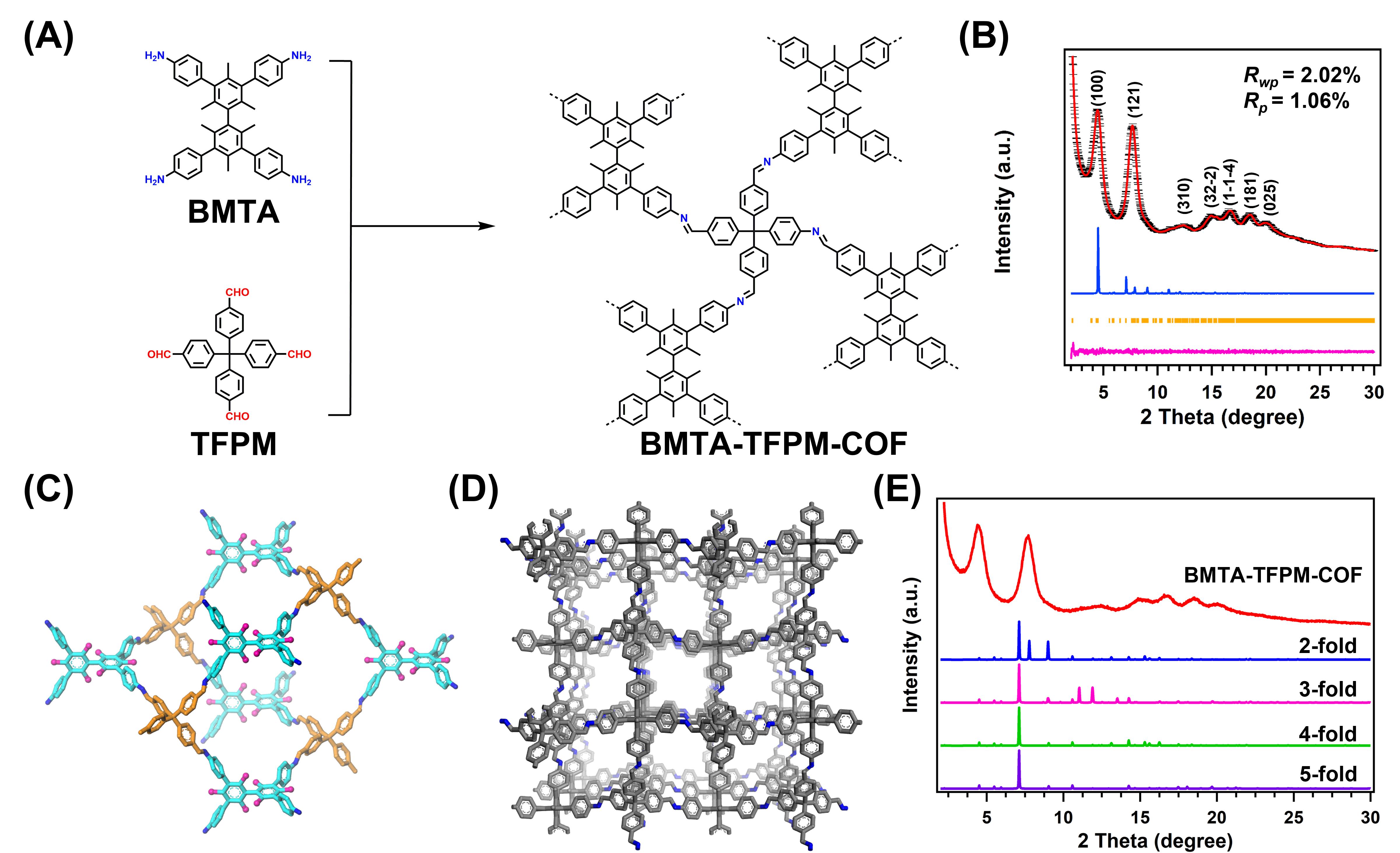 在此背景下,该团队研究人员利用两个四面体配体(BMTA和TFPM)构建了一个新型非互穿三维COF (BMTA-TPFM-COF)。合成的BMTA-TPFM-COF具有良好的结晶度并具有非互穿的dia拓扑结构,BET比表面积为1924 m2 g-1,孔容为1.85 cm3 g-1。重要的是,非折叠互穿的三维空间中具有高度开放的空腔以及大量暴露的C=N键,这有助于高容量、高选择性以及高稳定性的吸附金离子(Au3+)。这项研究为开发用于Au3+捕获的3D COFs提供了新的见解。