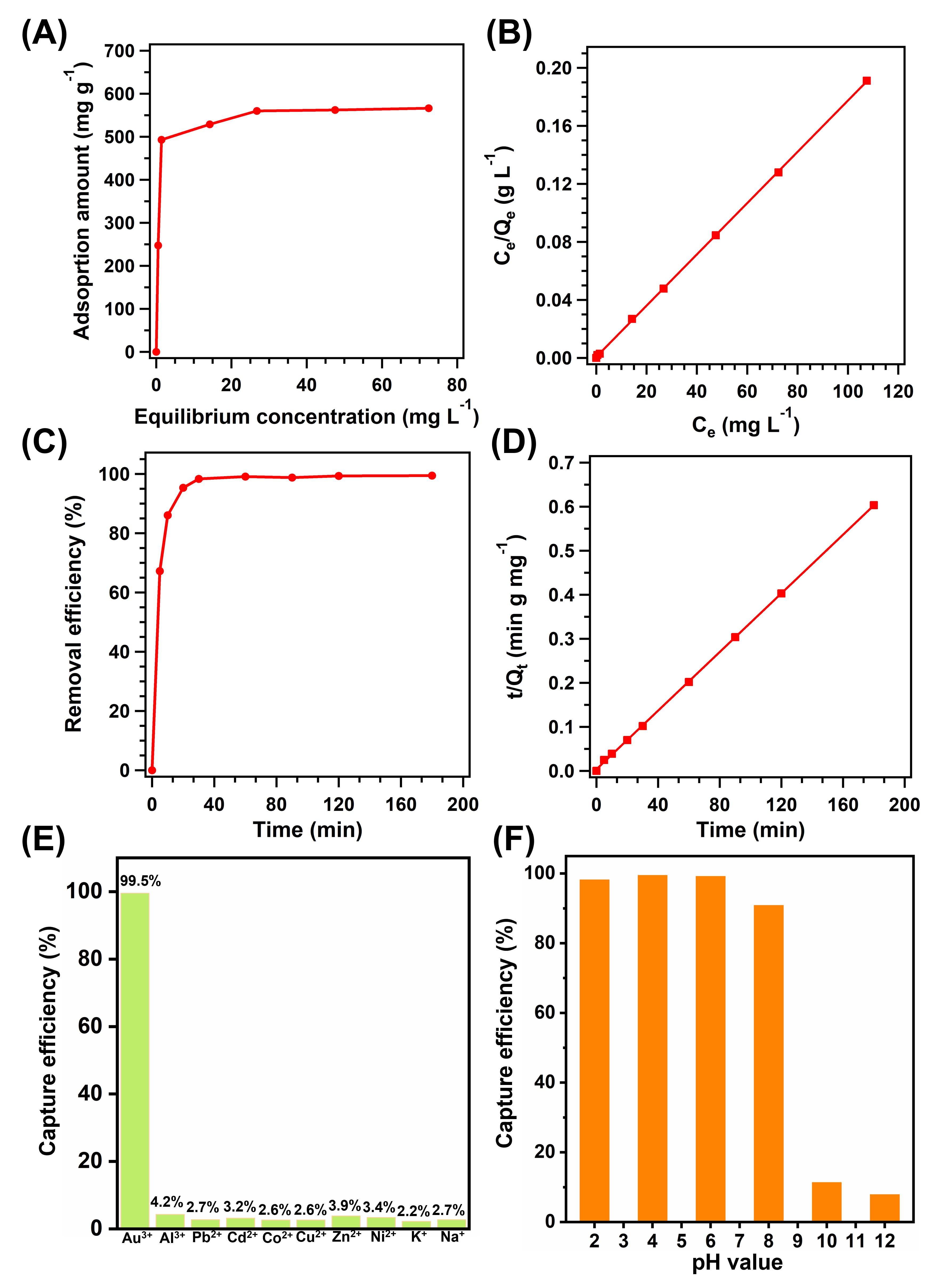 通过吸附实验可以发现, BMTA-TPFM-COF的相对最大Au3+捕获量为570.18 mg g-1。此外,BMTA-TPFM-COF表现出快速的吸附行为,这主要归因于其三维结构的大孔体积和更多的亚胺键暴露。此外,BMTA-TPFM-COF吸附Au3+的Langmuir平衡等温线分布系数为0.999,表明BMTA-TPFM-COF与吸附等温线拟合良好。BMTA-TPFM-COF的Au3+捕获量在5 min内达到最大值的68.3%,且在30分钟内通过一步吸附达到平衡,吸附效率为>99.4%。此外,还研究了对Au3+的选择性吸附,可以发现BMTA-TPFM-COF对Au3+的吸附纯度为99.5%。在pH=2和pH=12之间测试了不同pH条件下的Au3+捕获效率。在酸性溶液中,Au3+的捕获效率接近100%,而在碱性溶液中,捕获效率仅为15%。因此,质子化过程是捕获Au3+的关键。