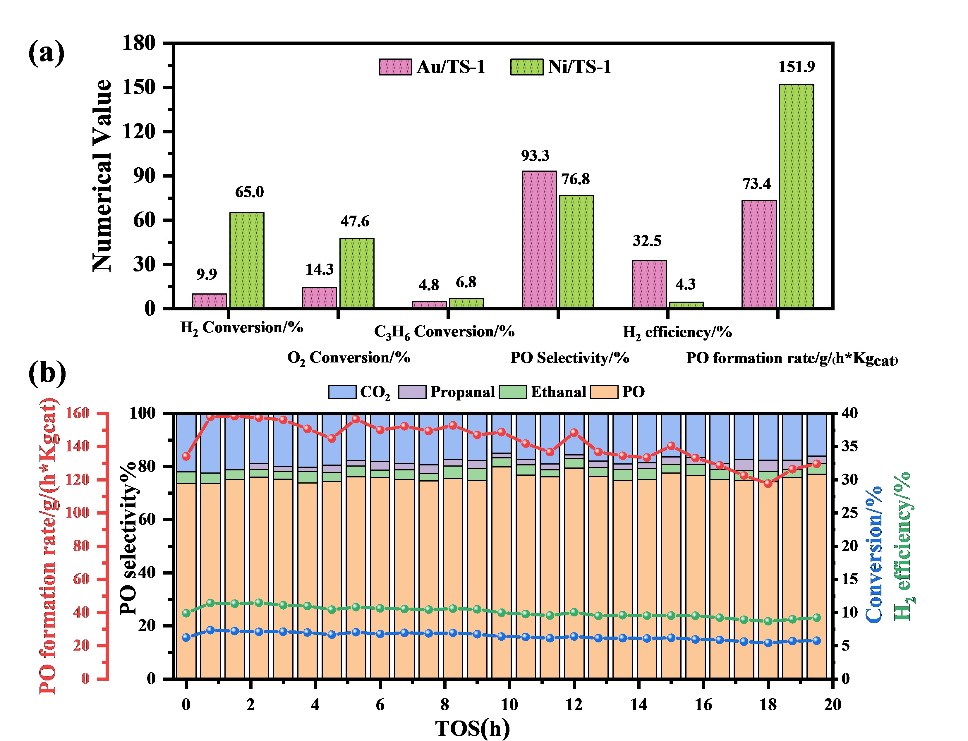 图2. (a) Ni/TS-1催化剂与Au/TS-1催化剂的催化性能比较;(b) Ni/TS-1催化剂稳定性