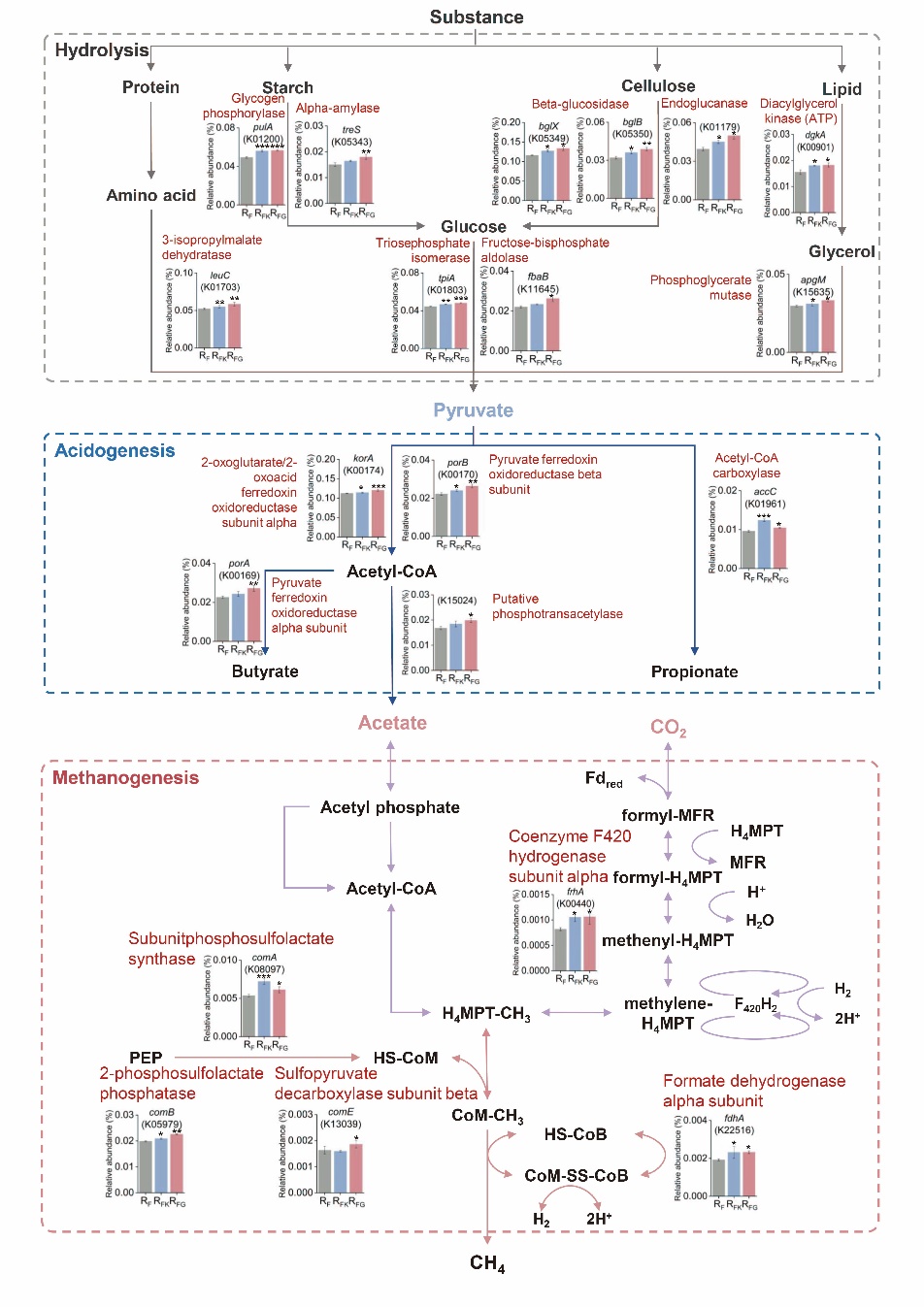 近日,赢乐lV史吉平研究员、刘莉研究员团队在基于宏基因组学的餐厨垃圾多组份协同高温厌氧消化产甲烷强化策略的机理研究方面取得进展,研究成果以“Metagenomic characterization of the enhanced performance of multicomponent synergistic thermophilic anaerobic co-digestion of food waste utilizing kitchen waste or garden waste as co-substrate”为题发表在Water Research期刊上(https://doi.org/10.1016/j.watres.2023.120457)。该研究探究了餐厨垃圾协同厨余垃圾(或园林垃圾)高温厌氧共消化的产气性能,确定了最佳的底物混配比例,并通过宏基因组学深入解析了底物协同厌氧消化机制,证实了共消化可以富集微生物菌群中的关键水解菌和嗜氢产甲烷菌,揭示了水解和产甲烷阶段编码关键酶的基因丰度的提高对强化产甲烷的促进作用,提供了一种基于优化微生物生境的低成本物料调配技术以提高甲烷产量。