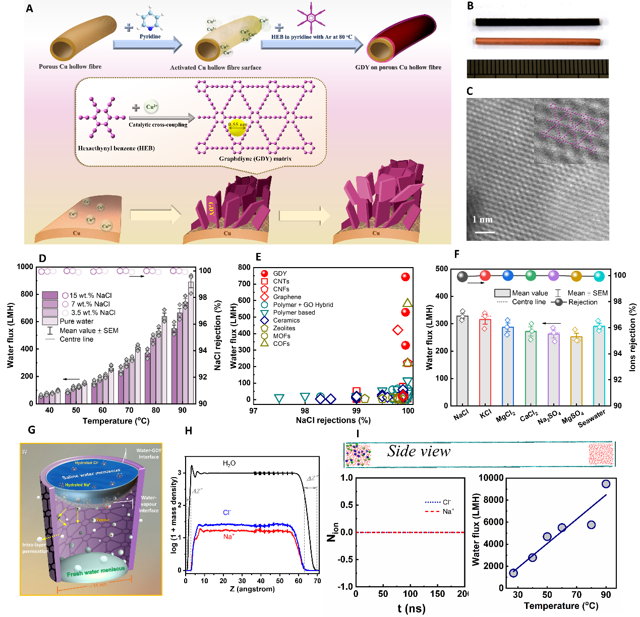 图 (A) 石墨二炔复合膜的制备示意图,(B) 载体与复合膜,(C) 高分辨结果,(D) 脱盐性能,(E) 性能比较,(F) 离子影响与真实海水性能,(G) 气液固界面示意图与(H) 盐离子界面分布密度,(I) 石墨二炔双层通道的盐离子与水的渗透性能。