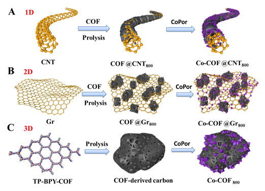 图1. 模板-热解法构建1D-3D衍生碳材料过程