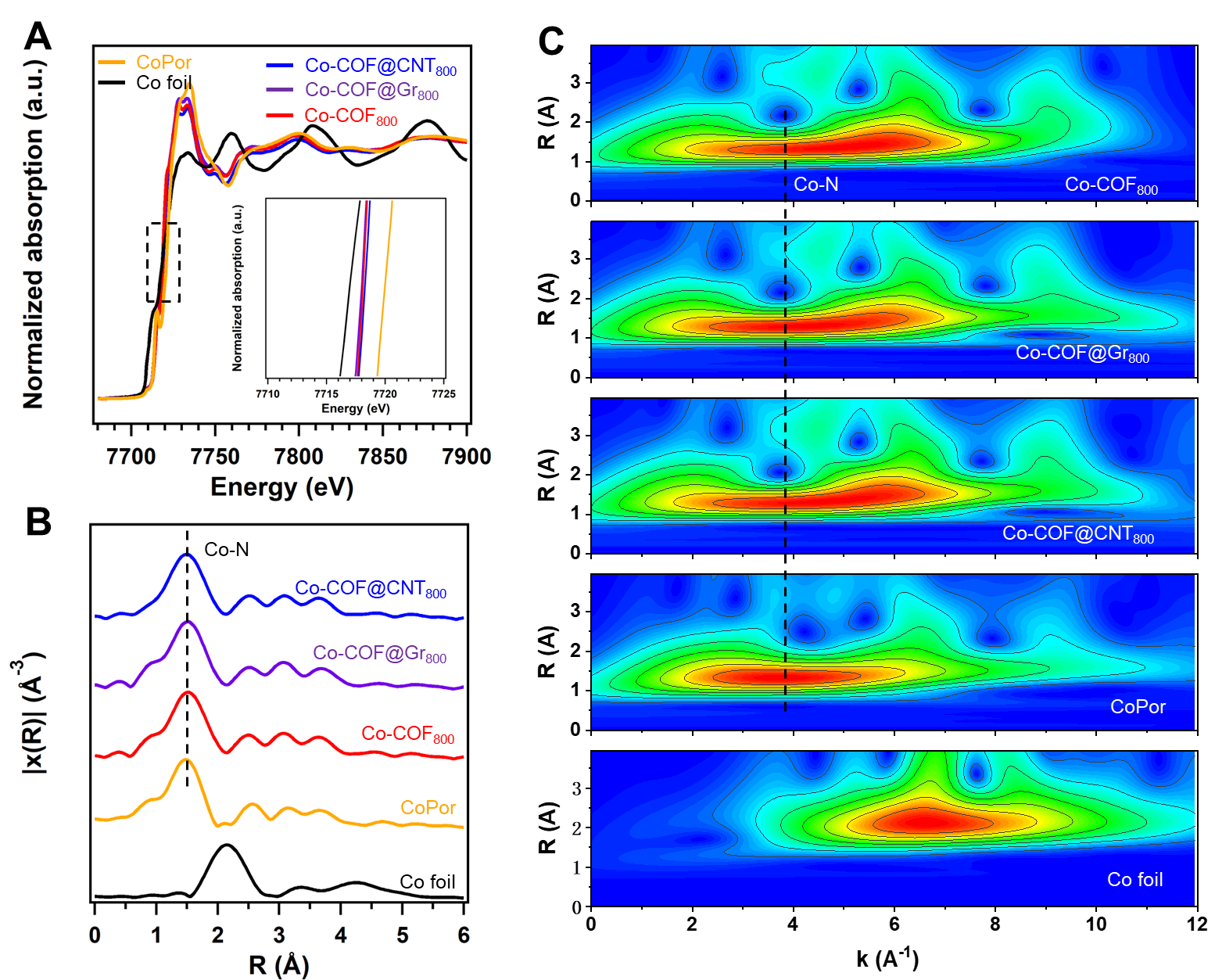 在此背景下,该研究团队以碳纳米管(CNT)和石墨烯(Gr)为模板,将COFs衍生碳的结构控制在一维(1D)到三维(3D)之间。比较研究了不同尺寸工程的COFs衍生碳对CO2RR性能的影响。EXAFS测试及拟合结果发现,催化剂中Co原子由五个N原子(Co-N5)配位,因此,通过将CoPor固定在COF衍生碳上成功构筑了新的催化位点(CoN5)。