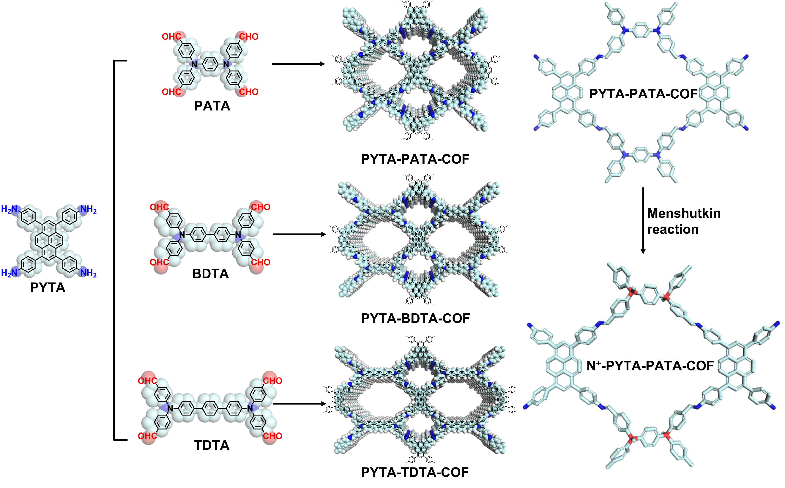金是一种高价值资源,被广泛应用于电子器件、珠宝行业和化学领域。然而,对黄金的消费和需求的增加导致了对生产和回收的要求。浸出液和电子垃圾的金含量约为200 ppm,远高于天然矿山。此外,天然矿山和电子垃圾中都含有铜、镉、铬、钴等多种竞争金属,这进一步导致了提取过程的难度和高能耗。因此,构建一种具有高捕获效率和高容量的选择性、可重复使用的金离子吸附剂至关重要。共价有机框架(COFs)具有明确的框架、可控的孔隙率、优异的化学稳定性和可设计的功能,因此COFs是离子吸附的理想模板。在COFs中引入功能基团已被证明可以捕获Hg2+, UO22+和Cr4+等多种离子。然而,大多数报道的COFs是通过氢键相互作用对离子具有特异性识别和高吸收量,主要工作都集中在用特定的基团(如硫醇和酰胺基团)构建氢键陷阱,却忽略了框架自身特性的开发。因此,构建高容量和快速捕获金的吸收框架是一个挑战。