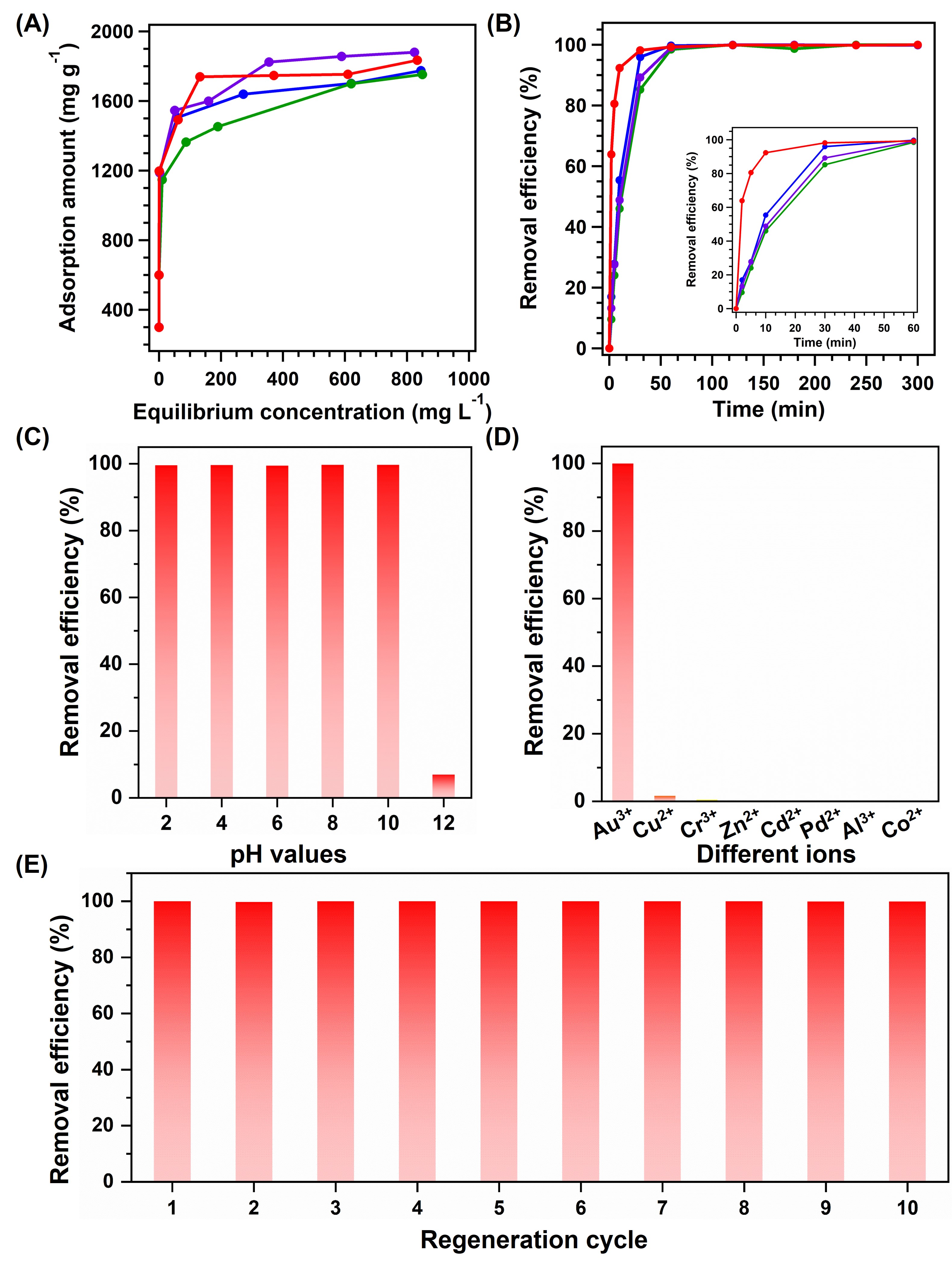 该项工作评估了所制备COFs对金离子的吸附性能。吸附等温线表明, PYTA-PATA-COF、PYTA-BDTA-COF、PYTA-TDTA-COF和N+-PYTA-PATA-COF的最大吸附量为1774、1752、1880和1834 mg g-1。针对实际金离子吸附场景为酸性溶液,该工作测试了pH=2和pH=12之间的金离子吸附效率。结果表明,在pH = 2 ~ 10范围内,金离子的吸附效率约为100%。此外,在含有多种竞争金属离子 (包括Cu2+、Cr2+、Zn2+、Cd2+、Al3+、Pd2+、Co2+和Au3+) 的复合浸出液中,N+-PYTA-PATA-COF对金离的选择性大于95%。同时,N+-PYTA-PATA-COF在10次循环中,吸附量稳定在100%左右,表明N+-PYTA-PATA-COF具有良好的可重复使用性。