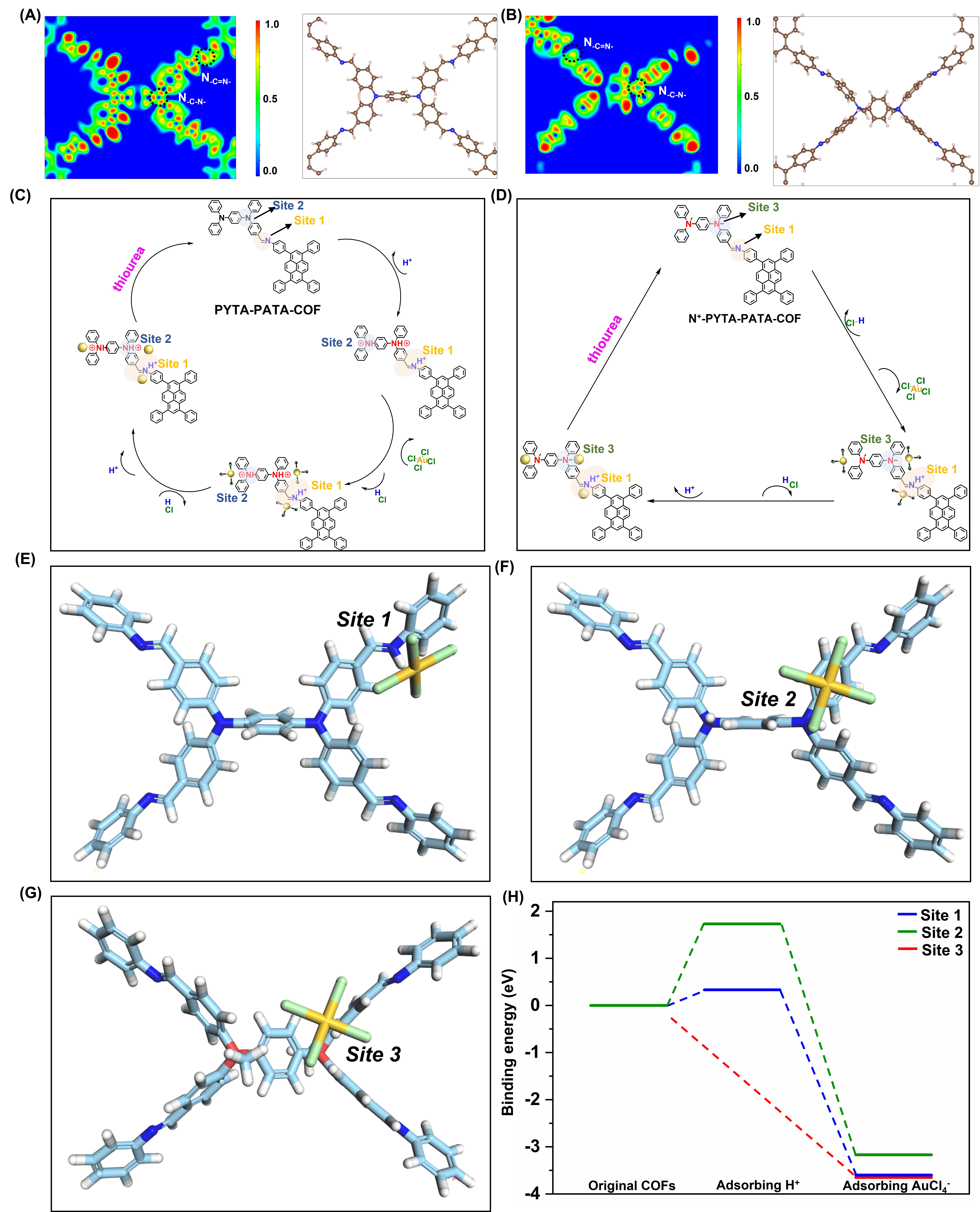 理论计算表明亚胺键具有高度局域化的电荷密度,有利于质子化。因此,离子型COFs具有更低的金离子吸附能耗。此外,离子氮键的ELF值更低,说明它可以作为与AuCl4?结合的电子受体。对于COFs来说,吸附过程的第一步是HAuCl4的质子攻击亚胺键与胺键,从而形成质子化位点。然后,质子化位通过库仑力吸附AuCl4?。最后,金离子通过自还原形成金颗粒。相应地,由于存在预先设计的离子骨架,离子型COFs会省略质子化过程,从而具有更快的响应与吸附动力学。