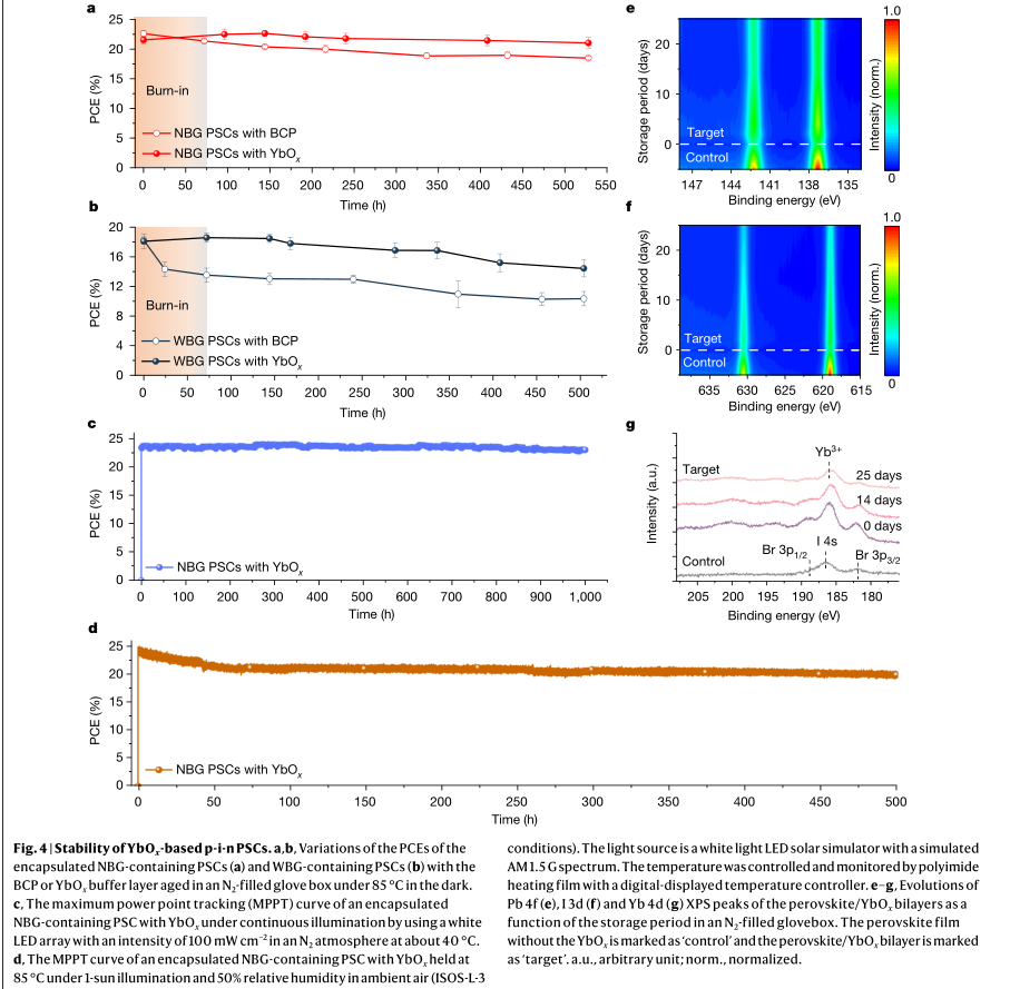 研究人员为解决太阳能电池在实际运行条件下的长期稳定性问题采用了新型缓冲材料——具有出色热稳定性和多功能性的氧化镱(YbOx)。通过可扩展的热蒸发方法成功制备了YbOx薄膜,并进行了详细分析(如图1所示)。并且在光照条件下跟踪了密封条件下PSCs的稳定性,证实了YbOx缓冲层显著提高了PSCs的长期操作稳定性。即使在多次外部应力下,YbOx缓冲层的器件在85 C高温和高湿度条件下仍能保持较好的稳定性(如图2所示)。