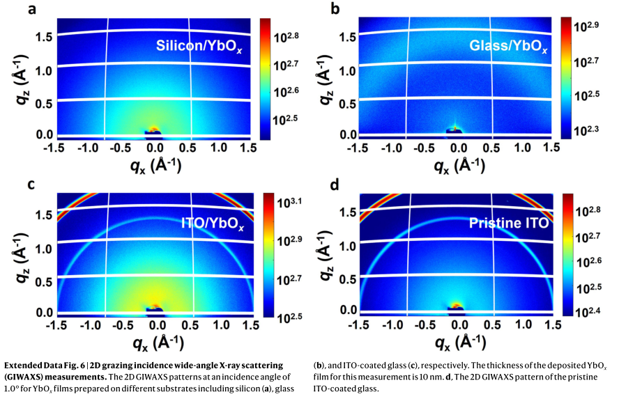 近日,北京大学龚旗煌院士、朱瑞、英国牛津大学Henry J. Snaith、云南大学吕正红院士、加拿大多伦多大学罗德映等人研究出一种化学稳定的多功能缓冲材料氧化镱(YbOx),通过可扩展的热蒸发沉积用于反式钙钛矿太阳能电池。在带有窄带隙钙钛矿吸收器的反式钙钛矿太阳能电池中使用了这种YbOx缓冲器,经认证的功率转换效率超过25%。相关成果以“Multifunctional ytterbium oxide buffer for perovskite solar cells”为题,在《自然》上发表。国家蛋白质科学研究(上海)设施BL19U1线站、BL17B1线站;上海光源BL14B1线站和辅助实验室为此项研究提供了研究机时和实验支持。其中,用户利用辅助实验系统进行样品制备相关工作,为后续实验提供可靠的材料基础;利用BL14B和BL19U1开展前期结晶实验的探索工作,利用BL17B1线站的GIWAXS技术,通过对不同基底上沉积的非晶态Yb薄膜进行结构探测,捕获了不同片层薄膜的晶相信息。本文实验中,使用的X射线波长为1.240 ?,掠射入射角为1.0 ,通过Pilatus 2M探测器进行数据收集。这些结果为进一步优化钙钛矿能源电池设计提供了重要支持。