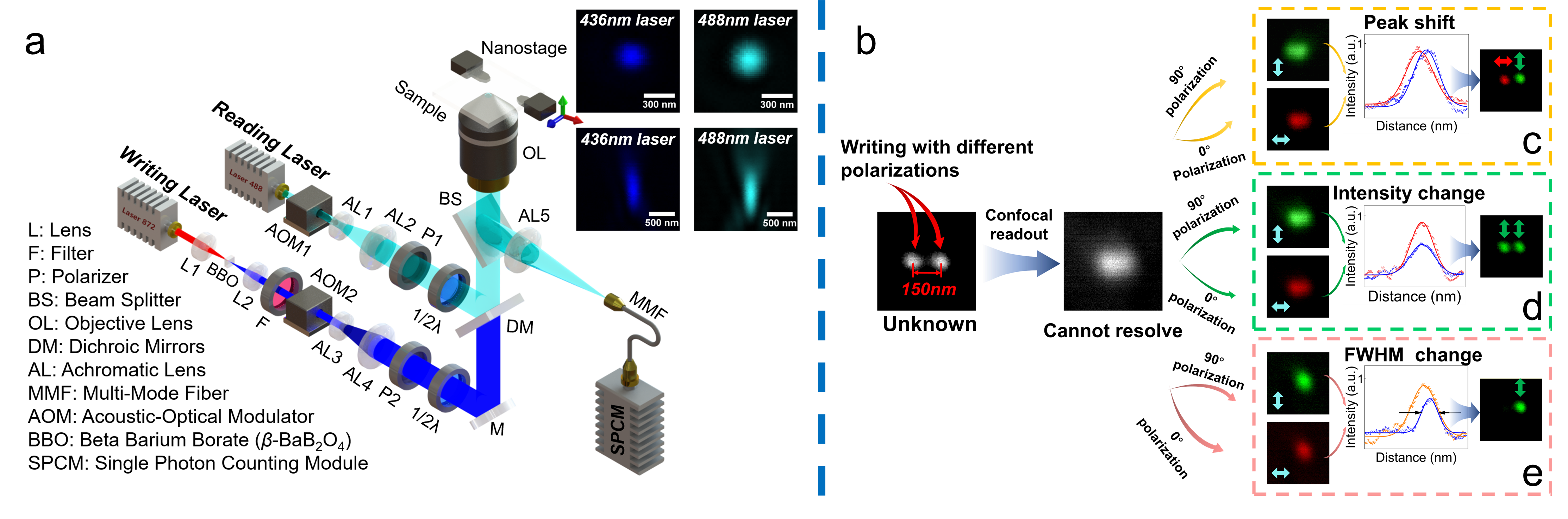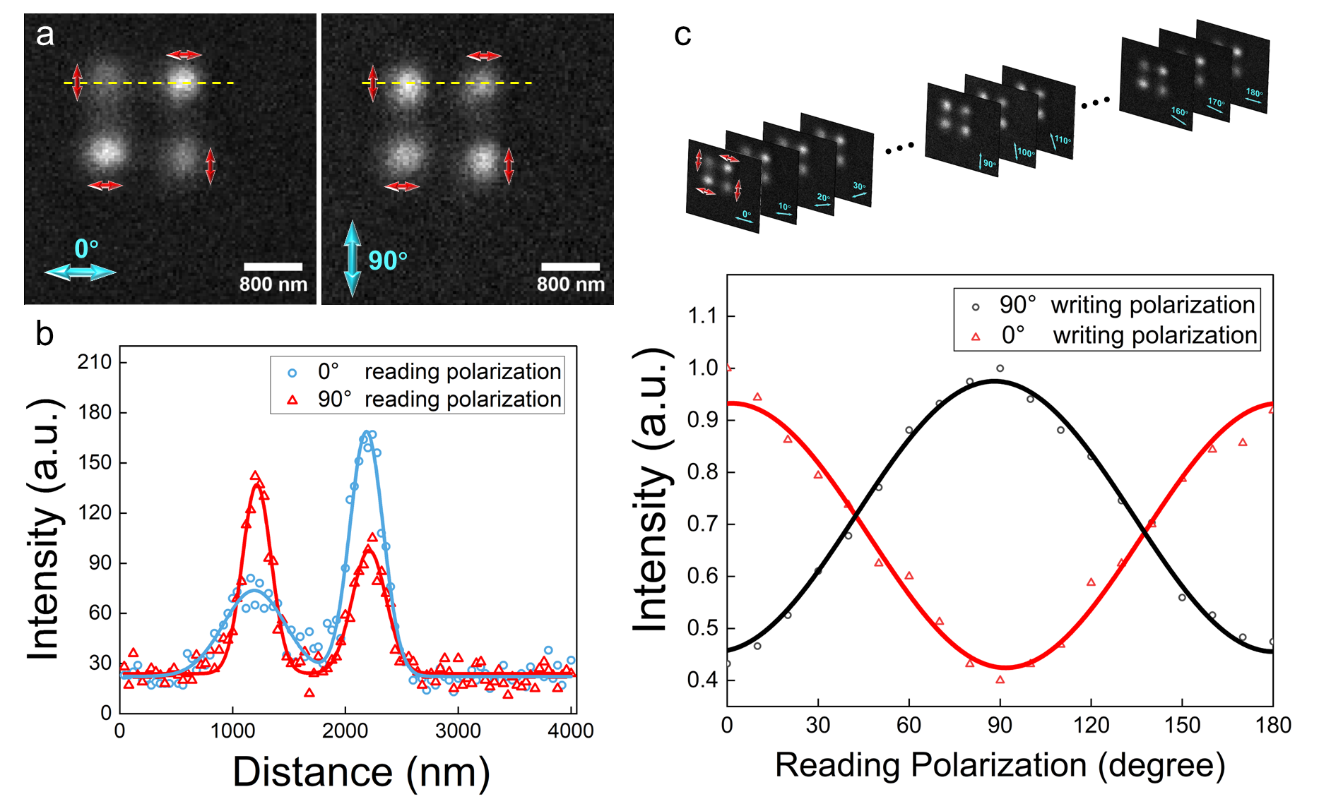 基于此,本课题组提出了一种基于偏振调制的超高密度光存储亚衍射极限读出方法。与传统的通过荧光信号实现超分辨读出的方式不同,我们利用读出光束的不同偏振来调控衍射极限内反射信号的强度变化,通过反射信号的变化解调出对应偏振编码的存储信息,如图1所示。