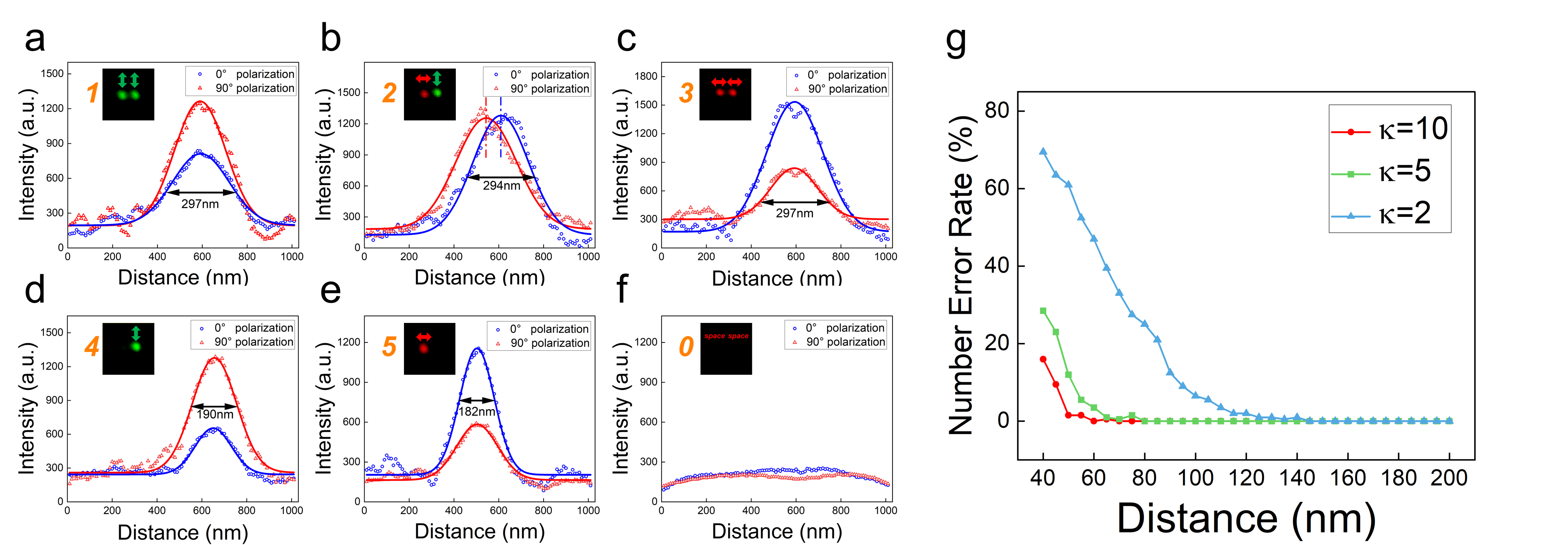 为了验证我们方法的可行性,我们制备了掺杂偶氮类染料DR13 (分散红13)的PMMA偏振调制薄膜,薄膜厚度为110nm,表现出κ ≈ 2的偏振选择特性,如图2所示。由于目前缺乏超分辨光存储偏振信息写入方法,我们对基于偏振调制亚分辨光存储读出方法进行了实验设计和测试;首先通过高NA (NA=1.4)物镜在DR13偏振薄膜上写入了500nm间距的偏振编码存储点,并通过低NA (NA = 0.5)物镜读出实验,实现了500 nm点间距的亚分辨光存储数据读出,超过了衍射极限1.2倍。连续无误码的读取5 × 5编码数字阵列,则证明了亚分辨光存储读出方法的可靠性和鲁棒性。同时,与现有的亚分辨光存储荧光读出方法相比,我们基于反射信号强度测量的方法具有更高的稳定性和读取速度,比RESOLFT快了约15倍。此外,与FQM或RESOLFT相比,我们的亚衍射极限光存储读出系统更简单,只需要在共聚焦显微镜中增加一个偏振片和半波片即可。通过模拟仿真,预测了在偶氮薄膜上,基于偏振调制亚分辨光存储读出方法具有150nm的分辨潜力,而如图3中所示,在具有更高偏振调制系数κ的偏振敏感材料,如金纳米棒和液晶材料,该方法具有实现70nm分辨率的潜力。