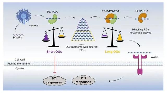 果胶多聚半乳糖醛酸水解酶(PG)是病原菌分泌的一类重要的致病效应子,具有保守的细胞壁降解酶活性,对病原菌的致病性至关重要。学界普遍认为多聚半乳糖醛酸酶抑制蛋白PGIP通过抑制PG酶活发挥抗病功能。然而,植物PGIP与病原菌PG互作激活植物免疫的分子机制一直不清楚。