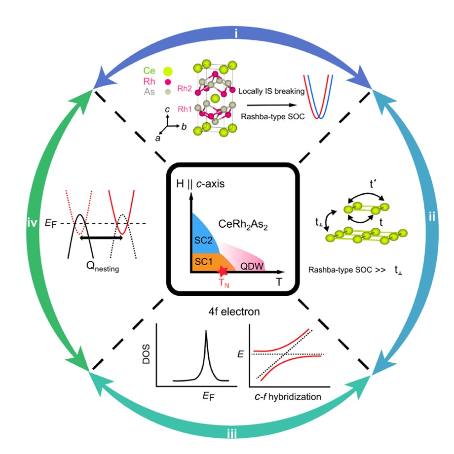 图 1 CeRh2As2的 H-T 相图。i, CeRh2As2的晶体结构。ii, 双层 Rashba-Hubbard 模型示意图。iii, 4f电子在费米能级附近巨大的态密度(左图),基于周期性安德森模型的4f电子与导带杂化示意图(右图)。iv, 能带嵌套示意图。