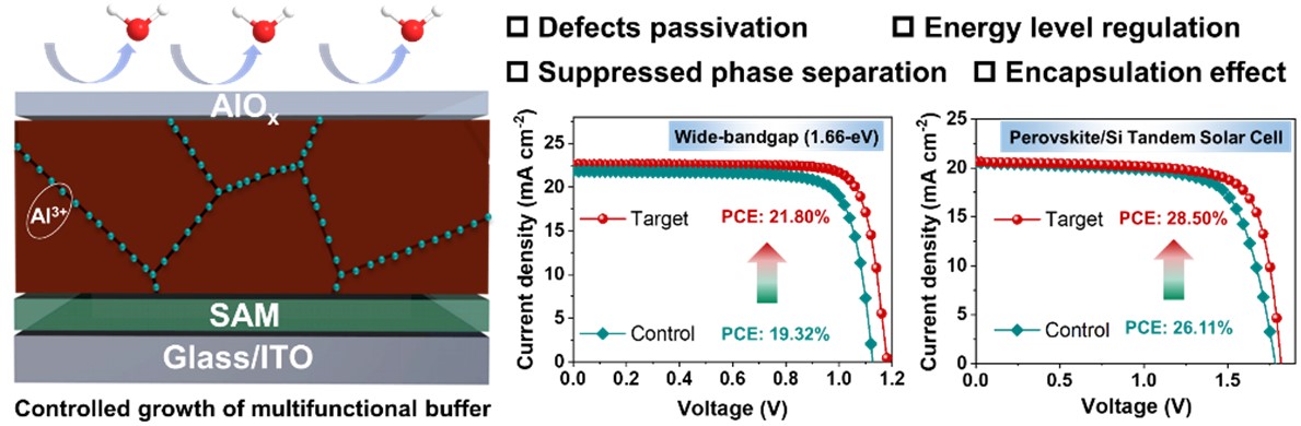 针对以上问题,赢乐lV鲁林峰、冀晓霏团队联合香港城市大学Alex K.-Y. Jen教授和付强博士,开发了一种简便高效的策略,通过在原子层沉积(ALD)技术在钙钛矿表面制备超薄氧化铝(AlOx)层来精确调节钙钛矿表面缺陷。。研究成果以“Multifunctional Buffer Layer Engineering for Efficient and Stable Wide-Bandgap Perovskite and Perovskite/Silicon Tandem Solar Cells”为题发表在Angewandte Chemie International Edition上。