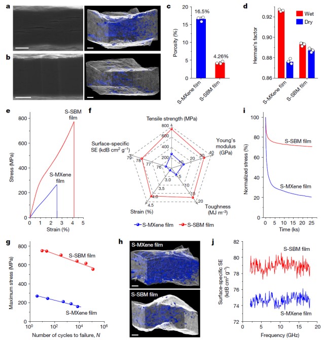 图a,b右图为根据纳米CT结果得到的S-MXene(a)和S-SBM(b)薄膜的三维重构结果。图h为循环拉伸前后MXene薄膜的纳米CT重构结果,首次证实了有序界面交联作用可以大幅抑制二维纳米复合材料内的裂纹扩展。