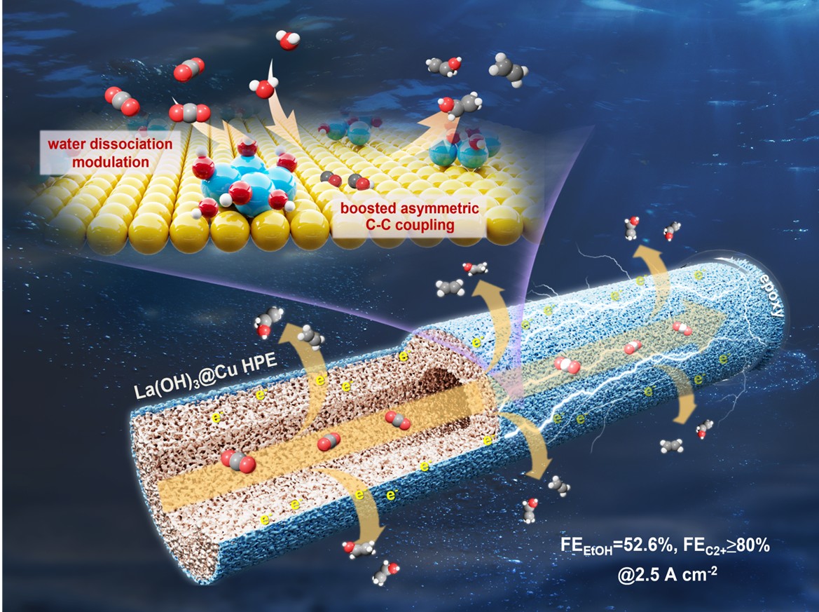 该研究通过在铜中空纤维上引入La(OH)3显著提高了CO2电还原至乙醇的性能。在2.5 A cm−2电流密度下,多碳产物法拉第效率达到80.4%,乙醇的法拉第效率为52.6%,稳定性超过240 h。原位红外、原位拉曼波谱结合DFT计算证实了La(OH)3增强了水活化,降低了不对称C-C耦合和乙醇生成的能垒,从而大幅提高了乙醇的活性和选择性。