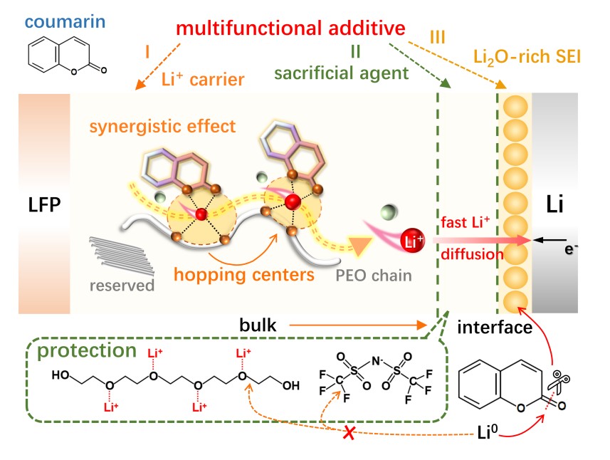 在聚氧化乙烯(PEO)基聚合物电解质中引入功能性添加剂,是提升其离子电导率和界面稳定性的有效策略。然而,传统添加剂虽能通过降低PEO结晶度来提高离子电导率,却不可避免地削弱了电解质膜的结构强度和机械性能。同时,无机添加剂易发生团聚现象,不仅破坏了其与聚合物基体的相容性,还导致电解质膜均匀性下降。更为关键的是,传统添加剂所形成的固体电解质界面(SEI)化学性质欠佳,不仅降低了电解质对锂金属的化学稳定性,还严重阻碍了界面处的锂离子传输动力学性能。这些局限性极大地制约了PEO基电解质在高性能固态电池中的应用前景。