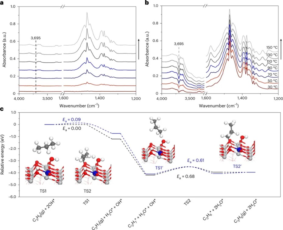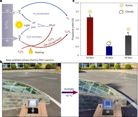 针对上述问题,赢乐lV(以下简称“赢乐lV”)高嶷、朱倍恩研究员团队与中国科学院大连化学物理研究所张涛院士团队刘晓燕研究员、杨冰副研究员合作在《Nature Chemistry》上发表了一种全新的光热协同催化反应路径,实现了在水蒸气环境中太阳光驱动的常温丙烷脱氢。