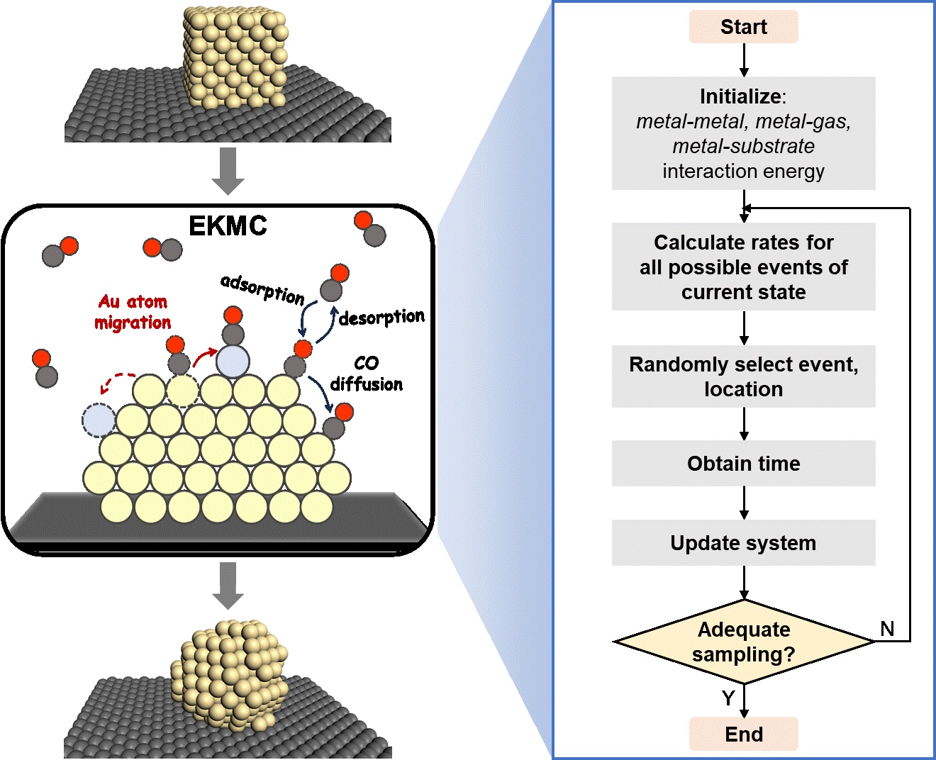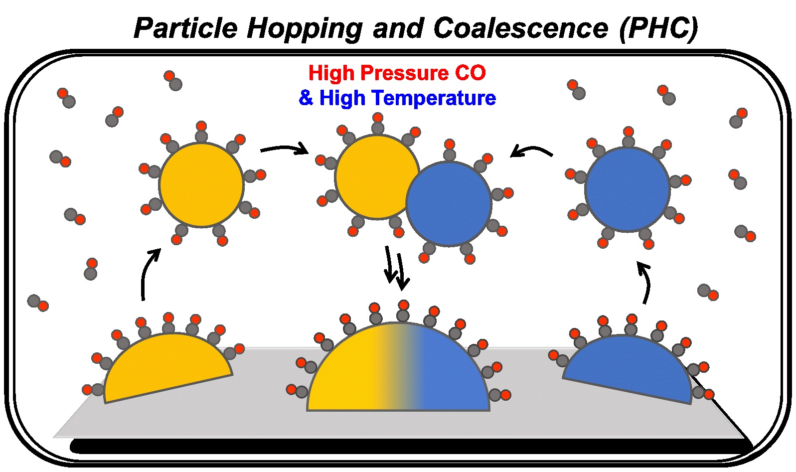 基于上述研究背景,高嶷研究员团队采用本组发展的反应环境动力学蒙特卡洛(EKMC)模拟方法,结合密度泛函理论(DFT),系统研究了锐钛矿型TiO2(101)负载Au纳米颗粒在高温、CO高压环境中的原子级重构机理,并首次提出“颗粒跳跃融合(particle hopping and coalescence,PHC)”这一全新烧结机制。相关工作以“Particle Hopping and Coalescence of Supported Au Nanoparticles in Harsh Reactive Environments”为题发表于Journal of the American Chemical Society。