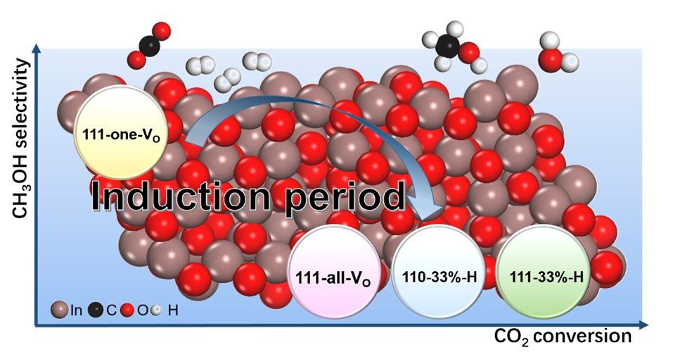 近些年,具有丰富表面氧空位的氧化铟(In2O3)催化体系倍受研究者关注,In2O3不仅在CO2加氢反应中表现出较高的甲醇选择性,还能与分子筛耦合将CO2直接转化为含两个碳以上的烃类化合物。基于In2O3的二氧化碳加氢制甲醇催化剂已取得较大进展,但仍存在转化率偏低、反应过程中存在逆水煤气变换反应生成一氧化碳副产物等问题。了解结构-活性关系,开发更高效的In2O3基催化剂,亟需对实际反应条件下活性位点的演变有深入的了解。研究团队通过沉积沉淀法制备了立方相的In2O3纳米颗粒,并评价了其催化二氧化碳加氢制备甲醇的反应性能,发现在达到反应的稳定阶段之前,在初始阶段有一个活化过程。通过多种不同的表征手段深入探究了In2O3纳米催化剂上二氧化碳加氢过程的诱导阶段,并结合第一性原理计算和谱学表征结果发现:催化剂的激活和诱导阶段,存在In2O3纳米颗粒的烧结和在In2O3表面更多氧空位的生成;氢诱导使催化剂在活化阶段产生了额外的氧空位,提高了In2O3催化剂的二氧化碳加氢性能;在诱导期形成的较高氧空位覆盖度表面和羟基化表面加快了二氧化碳反应速率,但却更多地促进了一氧化碳的生成,导致甲醇选择性降低。这项研究为显著提高In2O3基催化剂的二氧化碳反应活性并保持良好的甲醇选择性和长周期稳定性提供了有价值的见解。