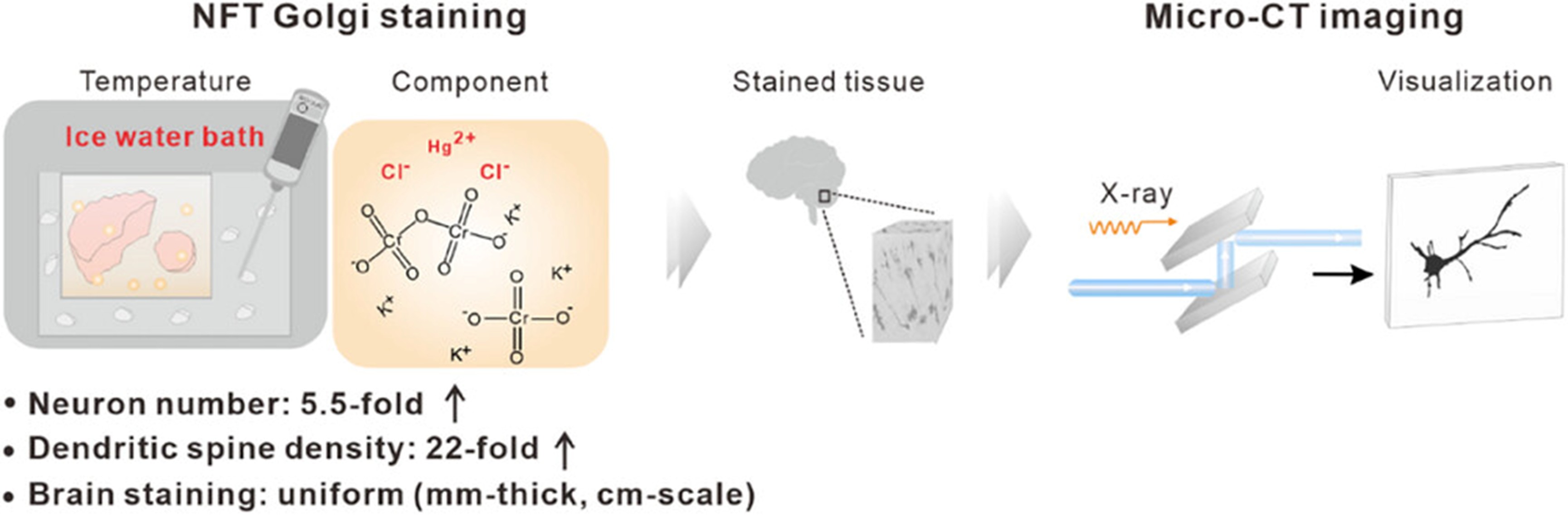 NFT高尔基染色法示意图。死后人脑组织使用NFT高尔基染色法浸染30天,随后进行同步辐射X射线三维成像分析。