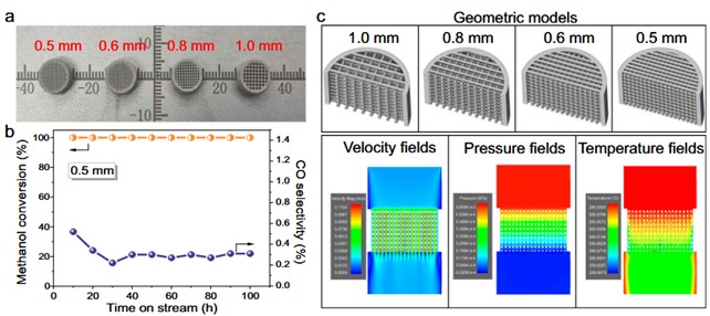 研究发现,与其他金属相比,由于Cd与P25相界面具有能量适配性,Cd原子可稳定锚定于P25的锐钛矿(101)-金红石(110)相界面缺陷处,形成具有不对称几何与电子特性的Cd-O-Ti相界面位点。这一独特结构增强了电子转移及反应物的吸附活化能力,使得其氢气产率分别是锐钛矿和金红石表面单原子位点的15倍与8倍,同时实现了100%甲醇转化率、超低CO浓度(~0.1 mol%)及超150小时的稳定性(图1)。通过H₂预处理后,相界面密度最高可达10.1 m² g⁻¹,氢气产率进一步提升至292.9 mmol・g⁻¹・h⁻¹。结合原位红外、动力学同位素效应及理论计算等表征手段,证实反应遵循甲酸盐分解路径,相界面位点显著降低了甲酸盐形成及H₂O吸附解离的能垒,同时抑制CO生成,从而解释了其优异性能的成因。此外,该粉末催化剂可通过3D打印制成千克级多孔整体式催化剂,进一步优化反应过程中的传质与传热效率,使CO浓度降至0.07 mol %(图2)。