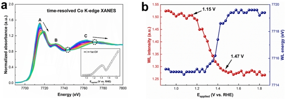 析氧反应(OER)是电解水制氢的限速步骤,其缓慢的动力学限制了电解水制氢技术的大规模应用。开发高效非贵金属催化剂(如钴基氧化物)是解决这一问题的关键。钴基氧化物在碱性条件下易发生表面重构,形成活性物种CoOOH,但其重构机制(如LOM机制)的动力学调控及活性位点生成规律尚不明确。目前常规的电化学原位XAFS实验技术(测量时间~10分钟)广泛应用于电压依赖的催化剂活性物种的精确识别上,但是对于预催化剂的快速结构重构过程,研究能力明显不足。