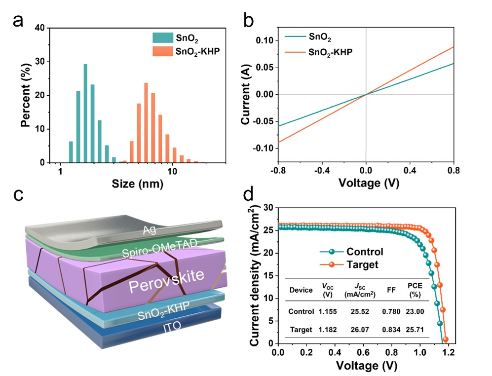 图1 (a) SnO2和SnO2- KHP胶体的DLS图;(b) ITO/SnO2和SnO2- KHP /Ag结构器件的暗态I-V特性曲线;(c-d)钙钛矿太阳能电池效率图。