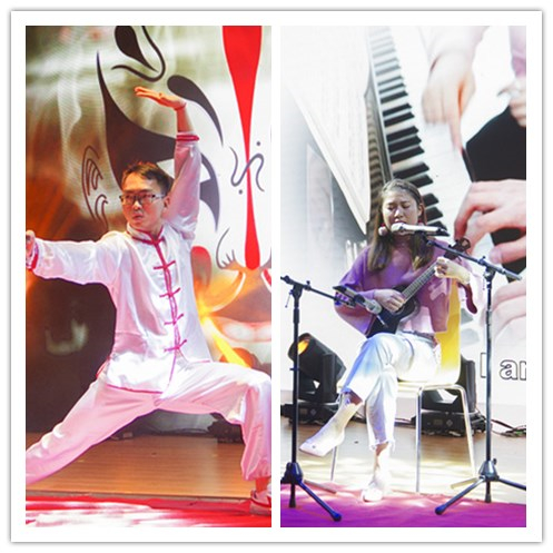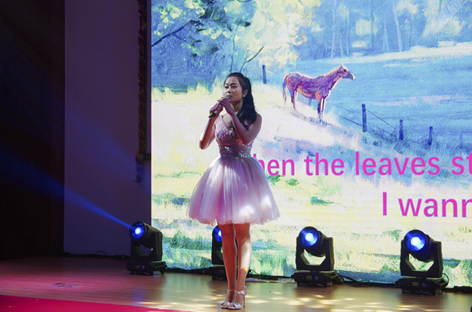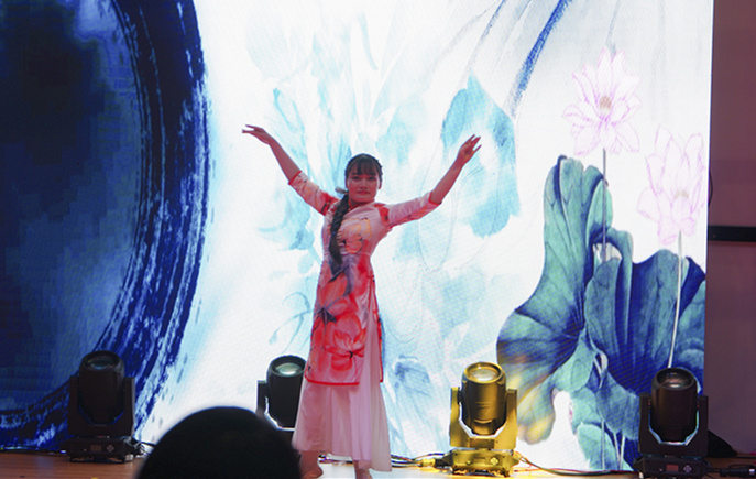 晚上6点整,全场灯光熄灭,hip-hop舞蹈《Shero》的劲爆开场,拉开了本次元旦晚会的序幕。热情洋溢的男女群舞,彰显了热烈红火的中国“年”特色,晚会热烈沸腾的气氛瞬间被点燃。晚会的第一篇章,上科大任苏苏同学带来的《音乐之声》,旋律简单优美,采用“约德尔”这种交换使用胸腔声和头腔声的专业唱法,用音乐向观众传达了浪漫的情感。由河南师范大学的黄燕同学带来的民族舞《花间梦》,婀娜多姿,现场观众仿佛置身于“莲叶何田田”的江南古镇,如痴如醉。而由高研院才女陈玉婷自编自导自演的尤克里里弹唱的《Happy days were gone》,用真实的画面与动人的演唱将大家带入一部凄美的爱情故事之中,如梦如幻,感人至深。随后,药物所研究生何志迪为观众带来了一场精彩的武术表演,与射雕英雄传的主旋律融为一体,招招凌厉,通过表演的形式展现并弘扬了中华民族的传统文化。