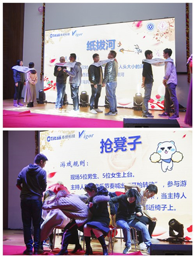 当然,穿插在节目中的游戏环节也让大家兴致盎然。经典游戏“纸拔河”、“抢椅子”,看似简单却又考验现场反应力,同时还得具备一定的运气,可谓“天时、地利、人和”三者缺一不可,配合着帅气靓丽的晚会主持人诙谐幽默地风格,游戏中乐趣连连,笑声满满。